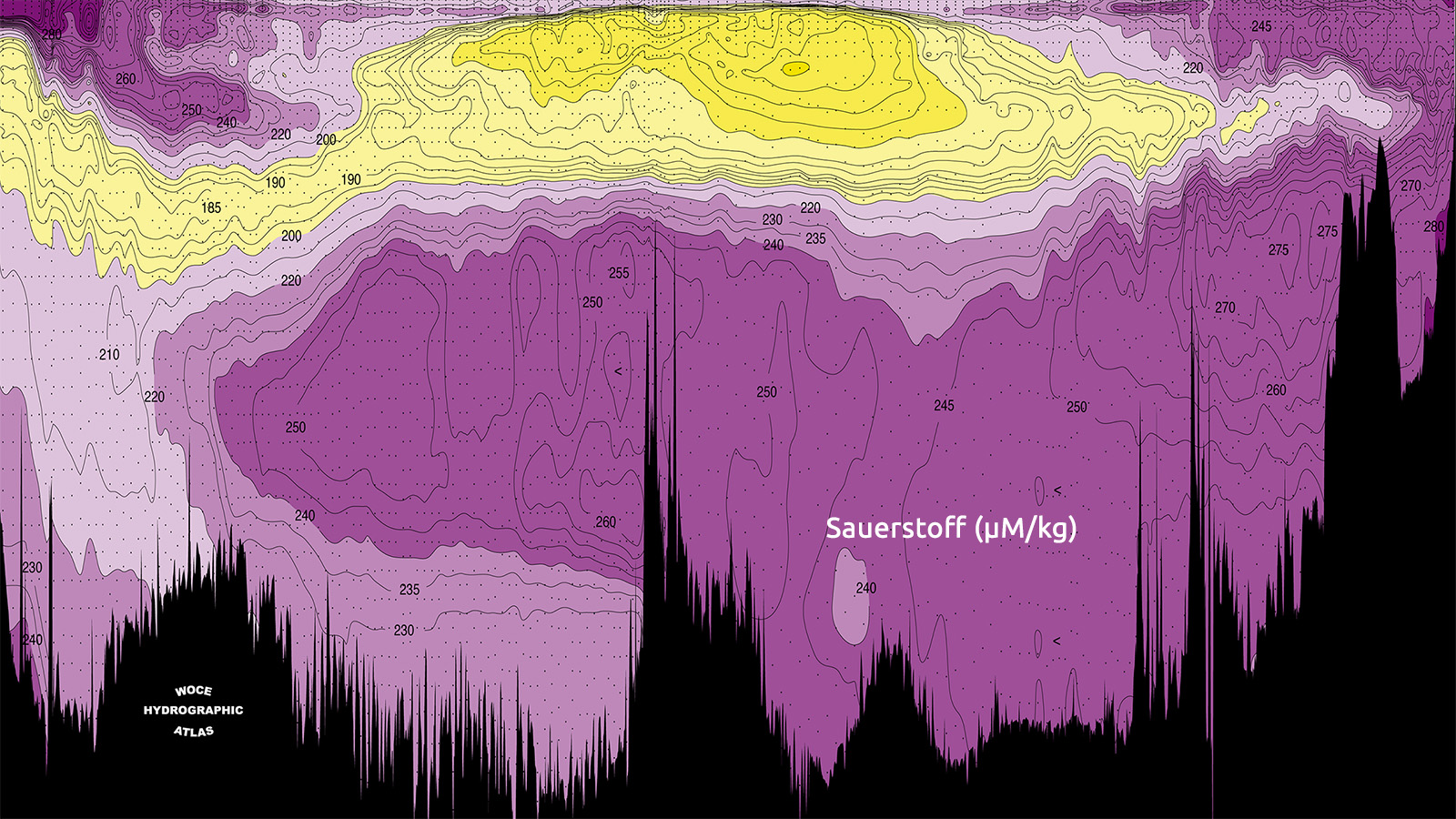 Im Rahmen des international koordinierten Forschungsprogrammes WOCE (World Ocean Circulation Experiment) wurde Ende der 1980er über einen Zeitraum von zehn Jahren versucht, so viele Informationen wie möglich über den mittleren Zustand der Ozeane zu gewinnen. Grafik: Schnitt durch den Atlantik von 54 Grad Süd bis 64 Grad Nord mit Daten zum Sauerstoffgehalt der WOCE Sektion A16.