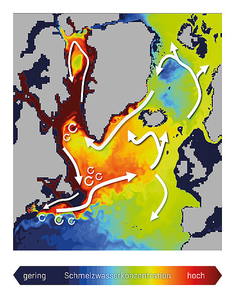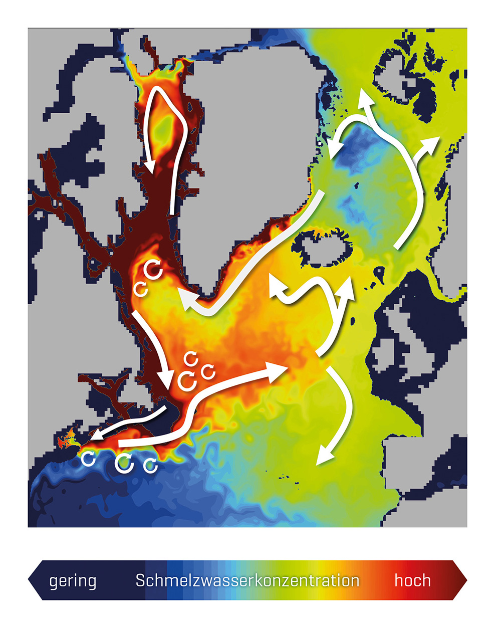 Am GEOMAR durchgeführte Studien weisen auf eine Unterschätzung des Einflusses auf die Ozeanzirkulation in aktuellen Klimamodellen hin. Letztere stellen im Gegensatz zu hochauflösenden Simulationen mesoskalige Ozeanwirbel von 10 bis 100 Kilometer nicht explizit dar. Diese Wirbel haben jedoch erheblichen Einfluss auf Zirkulation und Verteilung des Schmelzwassers. So stellt sich in Modellstudien schon nach wenigen Dekaden massiven Schmelzens eine Abschwächung der Wärmepumpe und erhebliche Abkühlung im nordatlantischen Raum ein.