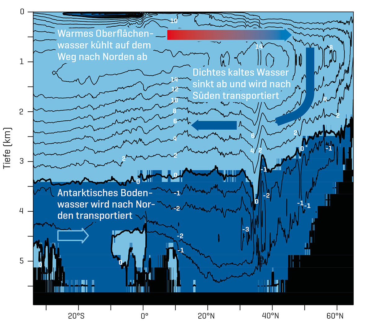 Langzeitbeobachtungen durch Verankerungen ermöglichen nur einen regional und zeitlich begrenzten Blick in den Ozean. Ozeanmodelle fügen diese zu einem Gesamtbild zusammen. Da Ozeanmodelle auf grundlegenden Gesetzmäßigkeiten der Strömungsmechanik und Thermodynamik basieren, ist dieses Bild physikalisch konsistent und gibt einen Einblick in das Zusammenspiel von Strömungssystemen und Wassermassen. Aufgrund der Vielzahl zu betrachtender Prozesse innerhalb des Ozeans und seiner Antriebsfaktoren wie Wind, Wärmeflüsse oder Niederschläge an der Grenzschicht Atmosphäre-Ozean sowie aufgrund der erforderlichen Auflösung gehören solche Simulationen zu den aufwändigsten Modellrechnungen, die nur durch Höchstleistungsrechner durchgeführt werden können. Eines der Flaggschiffe unter den Modellen der Ozeandynamik ist das hochauflösende Atlantikmodell VIKING20X. In diesem werden Geschwindigkeiten, Temperaturen und Salzgehalte in einem 3D-Gitter mit Maschenweite von wenigen Kilometern in der Horizontalen und 46 Tiefenschichten in der Vertikalen über Zeiträume der letzten 60 Jahre simuliert. Die Atlantische Umwälzzirkulation ist dabei eine der entscheidenden Kerngrößen für das Verständnis des Ozeans und seiner Auswirkungen auf das Klima und die Klimavariabilität. Sie wird aus der Gesamtheit der Ozeanströmungen berechnet und gibt die Stärke aus an der Oberfläche nach Norden strömenden warmen und in der Tiefe nach Süden strömenden kalten Wassermassen an.