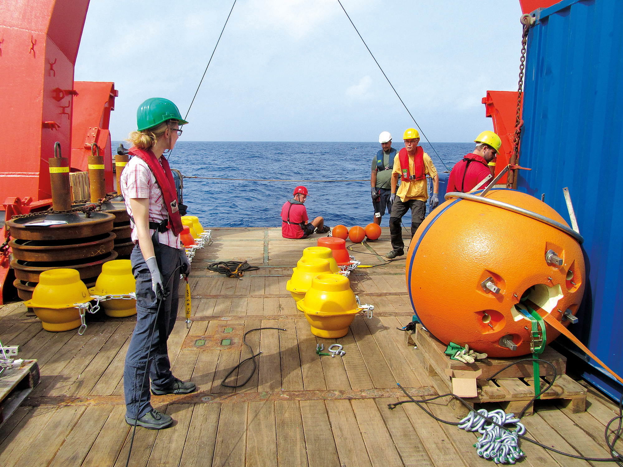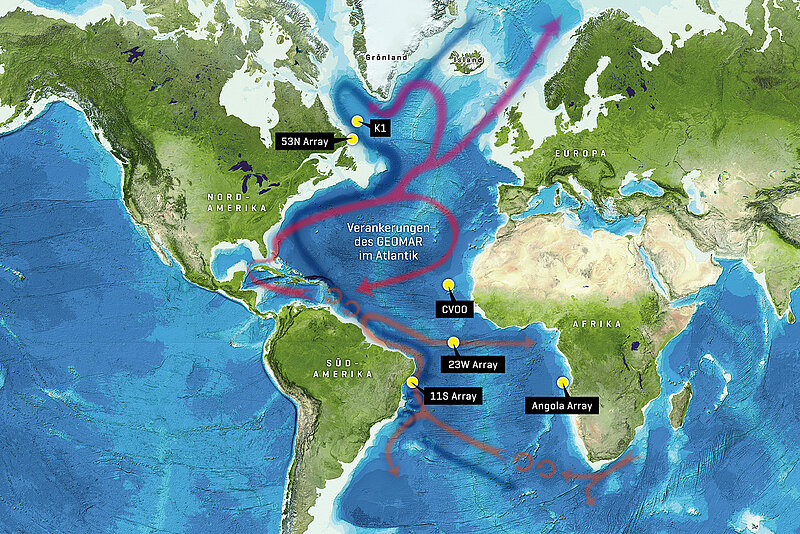 Forscher:innen des GEOMAR sind seit vielen Jahren aktiv an den internationalen Langzeit-Ozeanbeobachtungen beteiligt. Sie betreuen Verankerungen im Atlantik von der Labradorsee im Norden bis zu den Küstengewässern Angolas im Süden.