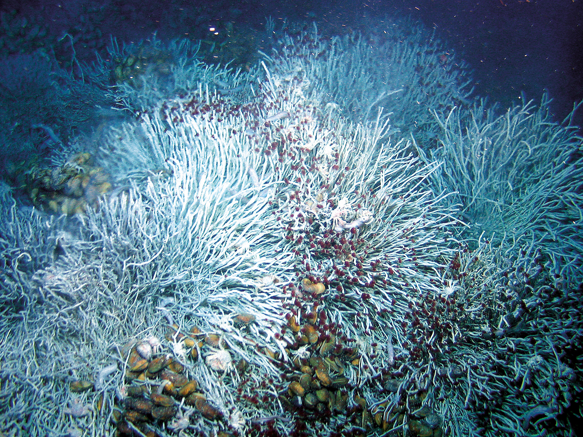 Basis dieses Ökosystems bilden Symbiosen. Urtümliche Bakterien beziehen, unabhängig vom Licht, ihre Energie aus der Umwandlung von Schwefel und Methan, der sogenannten Chemosynthese. Diese „dunkle Energie“, bei der keine Sonnenenergie zum Leben genutzt wird, können nur Mikroorganismen verwenden. Tiefseetiere wie Krebse oder Muscheln können selbst keine Chemosynthese betreiben, aber durch ihre enge Gemeinschaft mit den Bakterien bekommen die Tiere Zugang zu Nährstoffen, die die Bakterien durch Chemosynthese erzeugt haben.