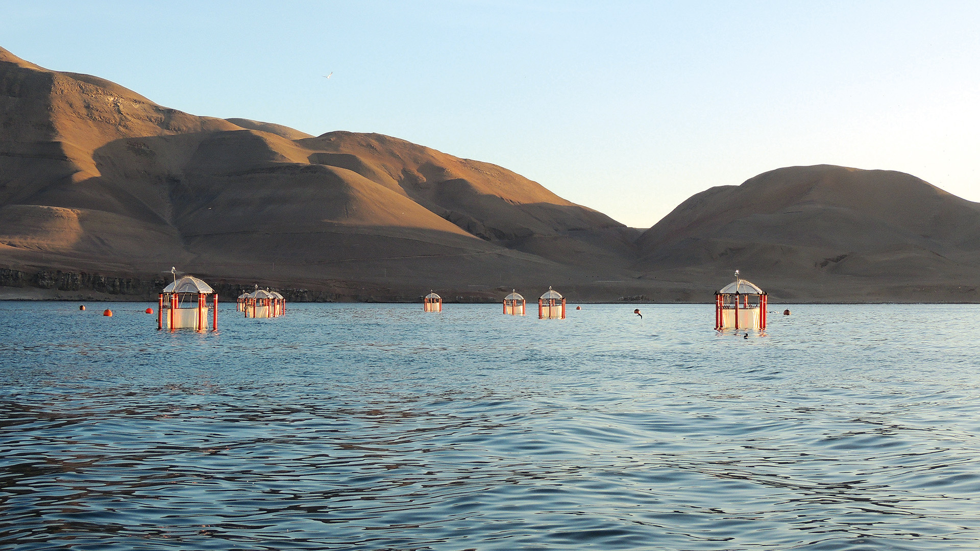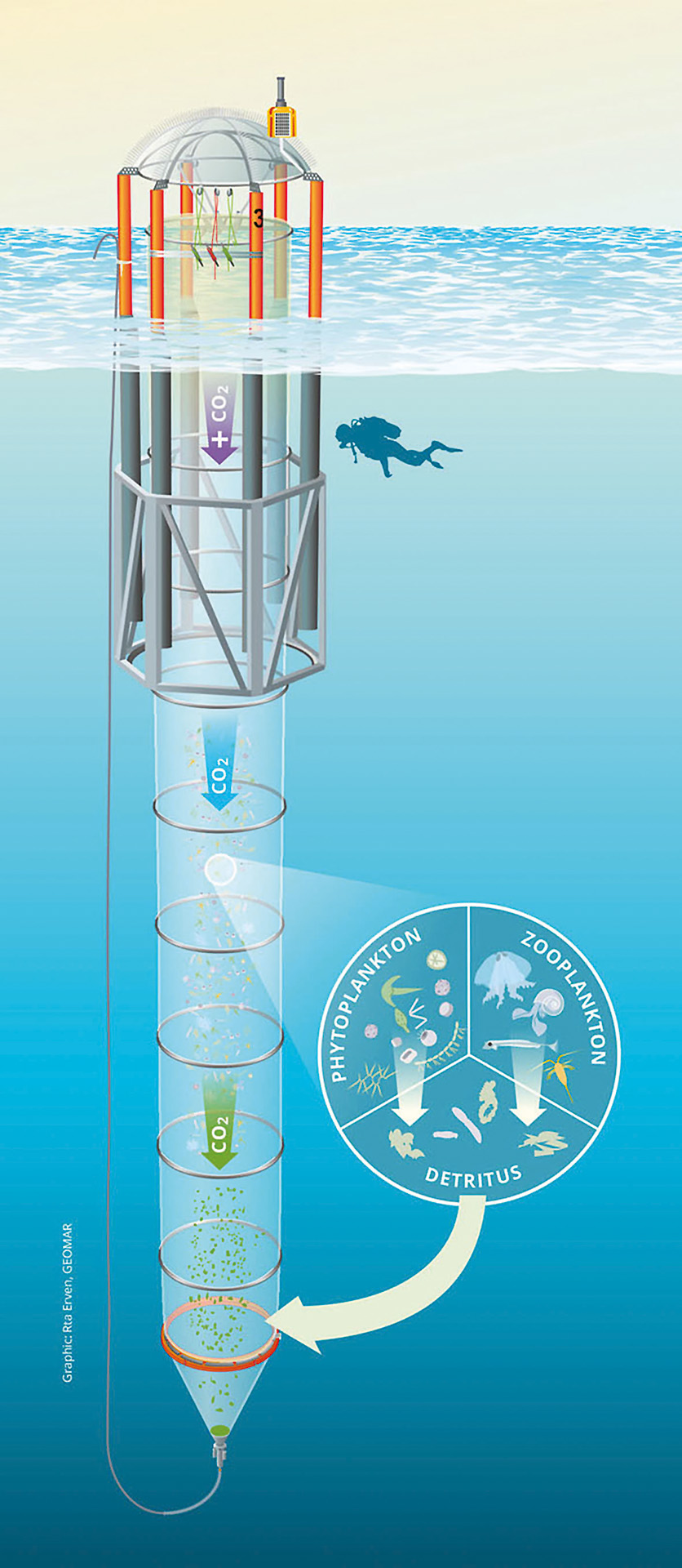 Wie reagieren komplexe marine Lebensgemeinschaften über einen längeren Zeitraum auf die Ozeanversauerung? Wie wirken sich die Reaktionen einzelner Spezies, aber auch der gesamten Planktongemeinschaft auf die Stoff- und Energiekreisläufe im Meerwasser aus? Wie beeinflussen diese Wechselwirkungen das marine Nahrungsnetz? Die KOSMOS (Kiel Offshore Mesocosms for Future Ocean Simulations) Mesokosmen ermöglichen einen Blick in den Ozean der Zukunft: In den abgeschlossenen Welten können zukünftige Bedingungen simuliert und die Reaktionen mariner Lebensgemeinschaften wie in riesigen Reagenzgläsern untersucht werden.