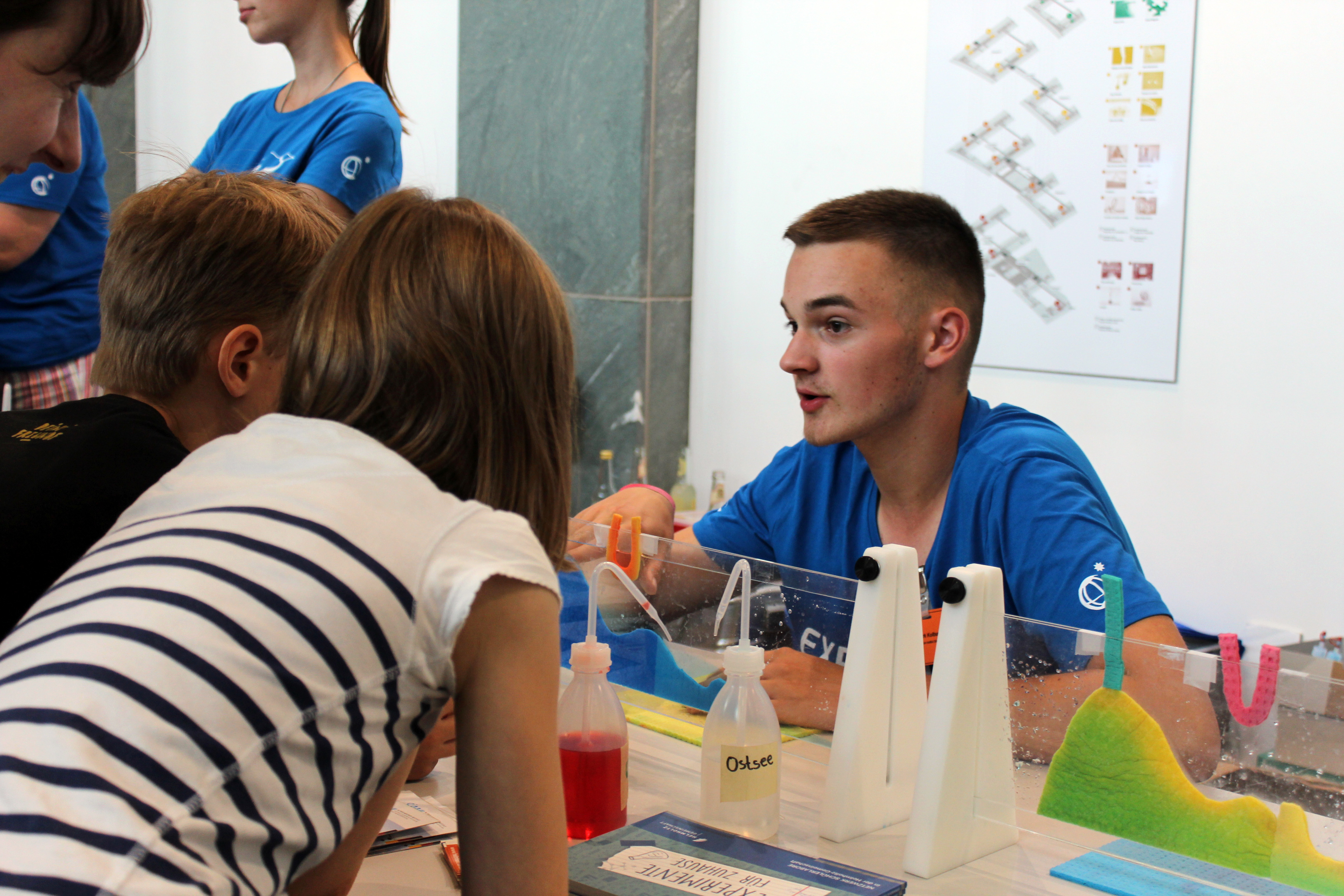 Wie eng Bildung und Forschung miteinander verknüpft sein können, zeigten beim diesjährigen Tag der offenen Tür der Bundesregierung die Schülerlabore in der Helmholtz-Gemeinschaft. An einem gemeinsamen Stand im Bundesministerium für Bildung und Forschung boten sie den Besucherinnen und Besuchern auf anschauliche Weise Einblicke in aktuelle Arbeitsthemen ihrer Forschungszentren, aufbereitet in leicht verdauliche Portionen, wie sie auch Schulklassen in den Schülerlaboren der Einrichtungen präsentiert bekommen: an handlichen Tankmodellen konnten Jung und Alt beispielsweise die Strömungsverhältnisse zwischen Nord- und Ostsee simulieren und sich so veranschaulichen, weshalb die tieferen Bereiche der Ostsee unter sehr geringen Sauerstoffgehalten leiden.
