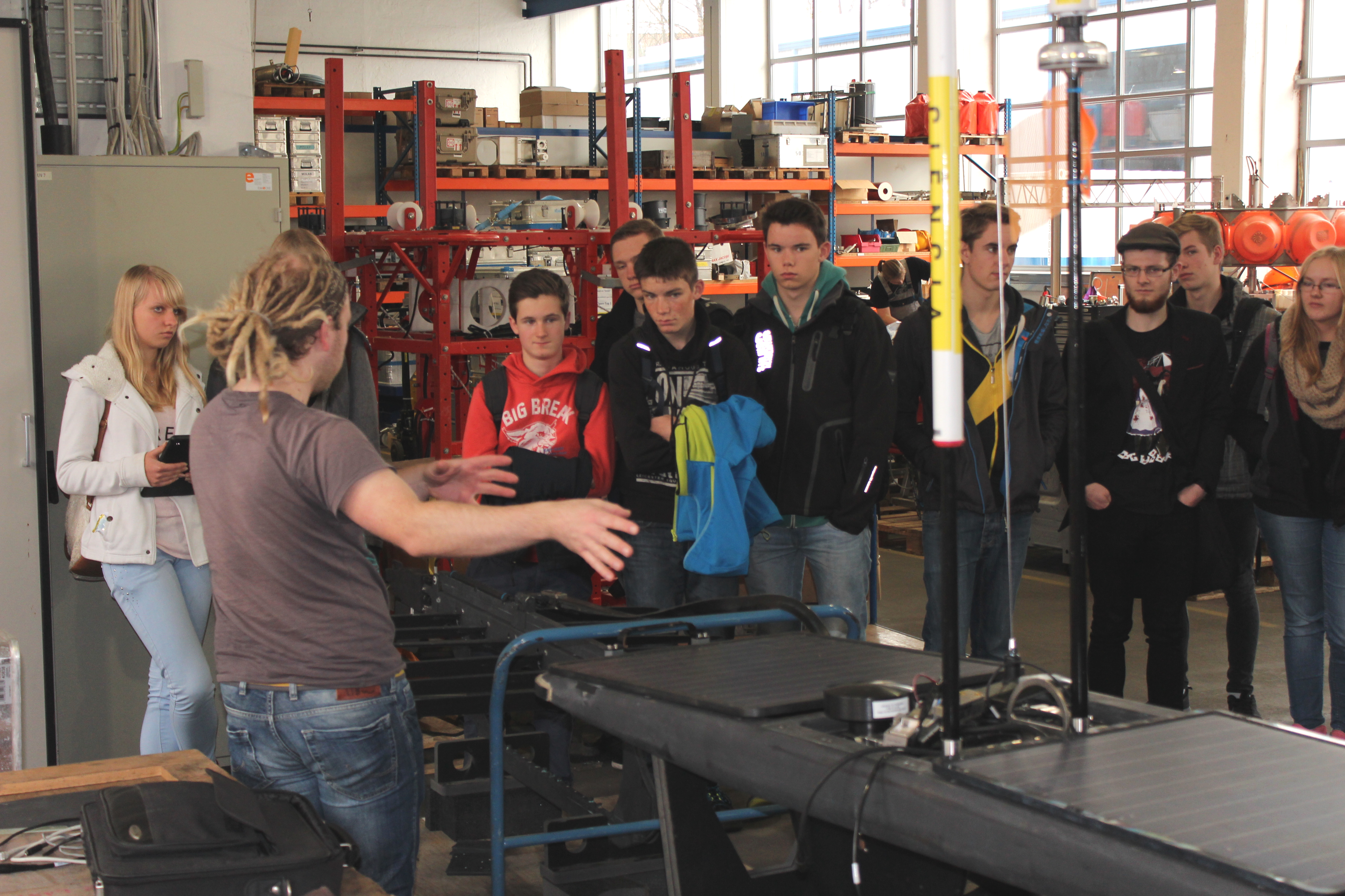 Besonders gut fanden die Schülerinnen und Schüler an dem Tag, dass es nicht nur bei der Präsentation von Vorträgen und Filmen blieb, sondern dass sie auch immer wieder die Möglichkeit hatten, die vorgestellten Roboter in der Gerätehalle des Technikzentrums am GEOMAR „live“ zu sehen, angefangen vom Container mit dem Leitstand des ROV 6000 bis hin zu einem in seine Bestandteile zerlegten Waveglider. Besonders letzterer faszinierte die Besucher: das Surfbrett-ähnliche Fahrzeug kann nur mit Hilfe der Energie von Wellen und Sonne über Monate hinweg selbstständig Routen im offenen Ozean abfahren und vermessen, die ihm über Satellit vom GEOMAR aus vorgegeben werden.