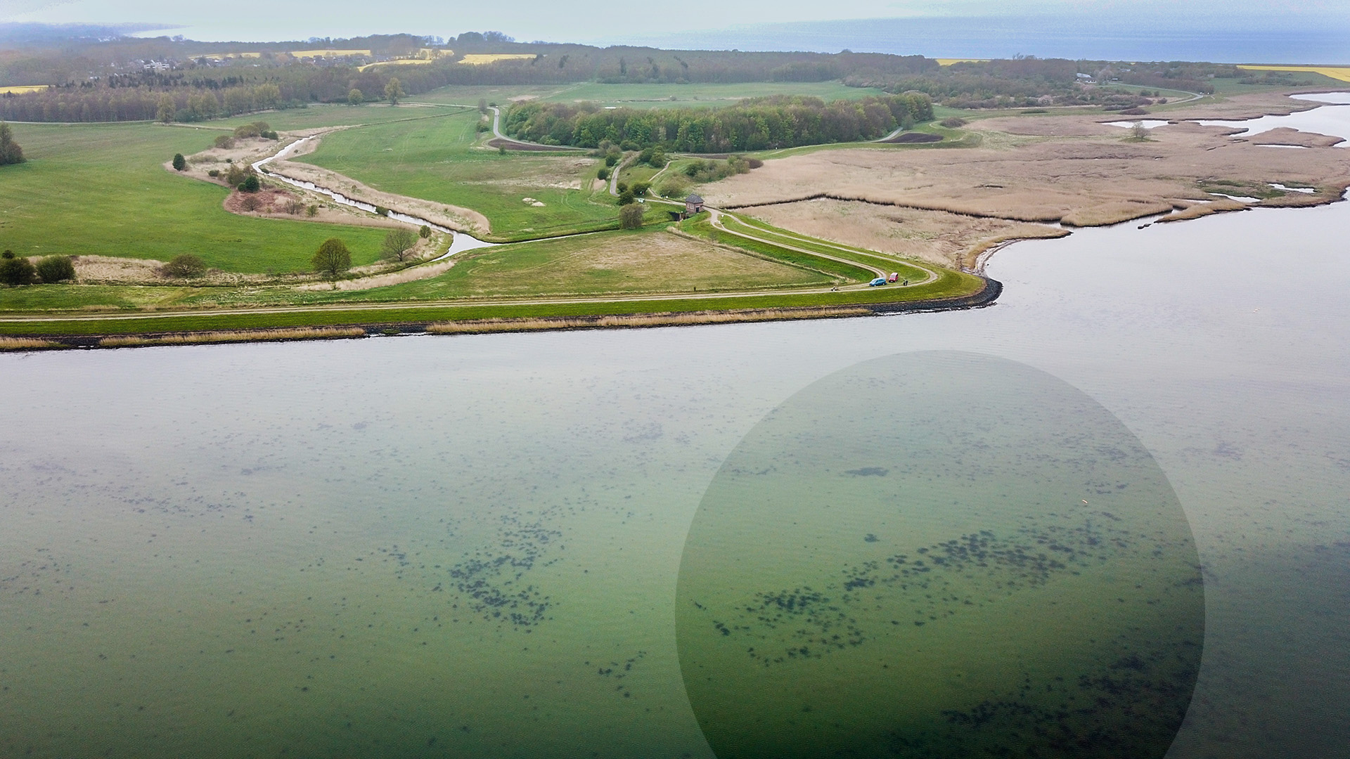 Unter welchen Bedingungen wächst Seegras am besten? Luftaufnahme einer SeaStore-Versuchsfläche zur Wiederanpflanzung von Seegras (im Kreis markiert) in der Schleimündung vor Maasholm 2023. Foto: Sarah Kaehlert/GEOMAR