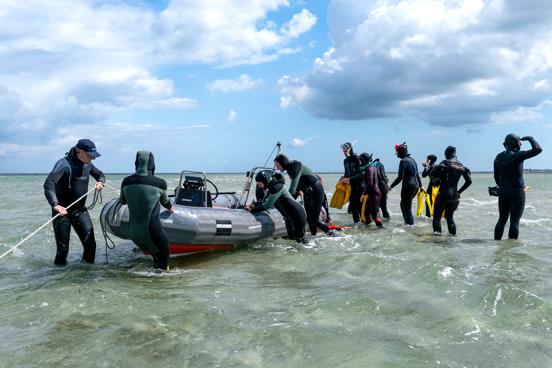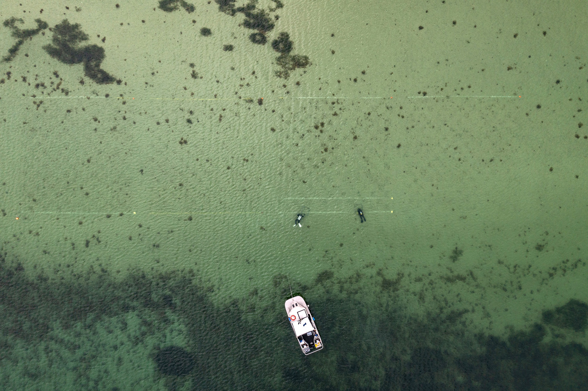 Forschungstaucher bei der Anlegung eines Seegras-Renaturierungsfeldes in der Flensburger Förde 2022. Im Rahmen von SeaStore werden verschiedene Standorte auf ihre Tauglichkeit zur Wiederanpflanzung geprüft. Foto: Uli Kunz, uli-kunz.com
