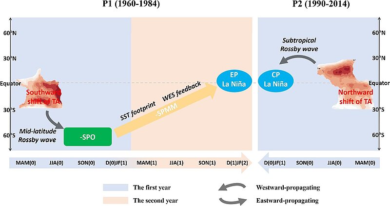 During 1960–1984 (P1), when spring-to-summer TA mode moves southward, the South Tropical Atlantic (STA) warming can force South Pacific Oscillation (SPO)-like atmospheric circulation anomalies by an eastward-propagating Mid-latitude Rossby wave, which can then induce a South Pacific Meridional Mode (SPMM)-like sea surface temperature (SST) footprint during the winter of the first year. The SPMM interacts with the trade winds and extends negative SST anomalies equatorward into the equatorial Pacific through the wind–evaporation–SST (WES) feedback, leading to an eastern Pacific (EP)-type La Niña event over the equatorial Pacific during the winter of the second year. During 1990–2014 (P2), when spring-to-summer TA mode moves northward, the North Tropical Atlantic (NTA) warming can quickly initiate a central Pacific (CP)-type La Niña event through a westward-propagating subtropical Rossby wave during the winter of the first year.