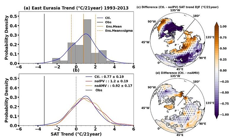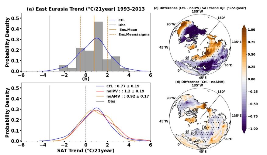 The Probability Density Function of the DJF-surface air temperature (SAT) trend for the period 1993–2014, averaged over the region between 60°E–120°E and 45°N–60°N (box shown in Figure 3). (a) Control ensemble (Ctl), the gray bars represent the estimates from the individual members, the blue line is the fitted distribution based on kernel density estimation, and the solid black line depicts the ERA5-SAT trend. The ensemble mean of the Ctl ensemble is indicated by the solid orange line, with the orange dashed lines representing the ±standard deviation (sigma). (b), Fitted Probability Density Functions from the Ctl and the noIPV and noAMV ensembles. The numbers in the legend are the ensemble mean and standard deviation obtained by applying a bootstrapping method. Panels (c, d) show the ensemble mean difference between Ctl and noIPV and noAMV, respectively. Dots indicate statistically significance at the 95% confidence level.