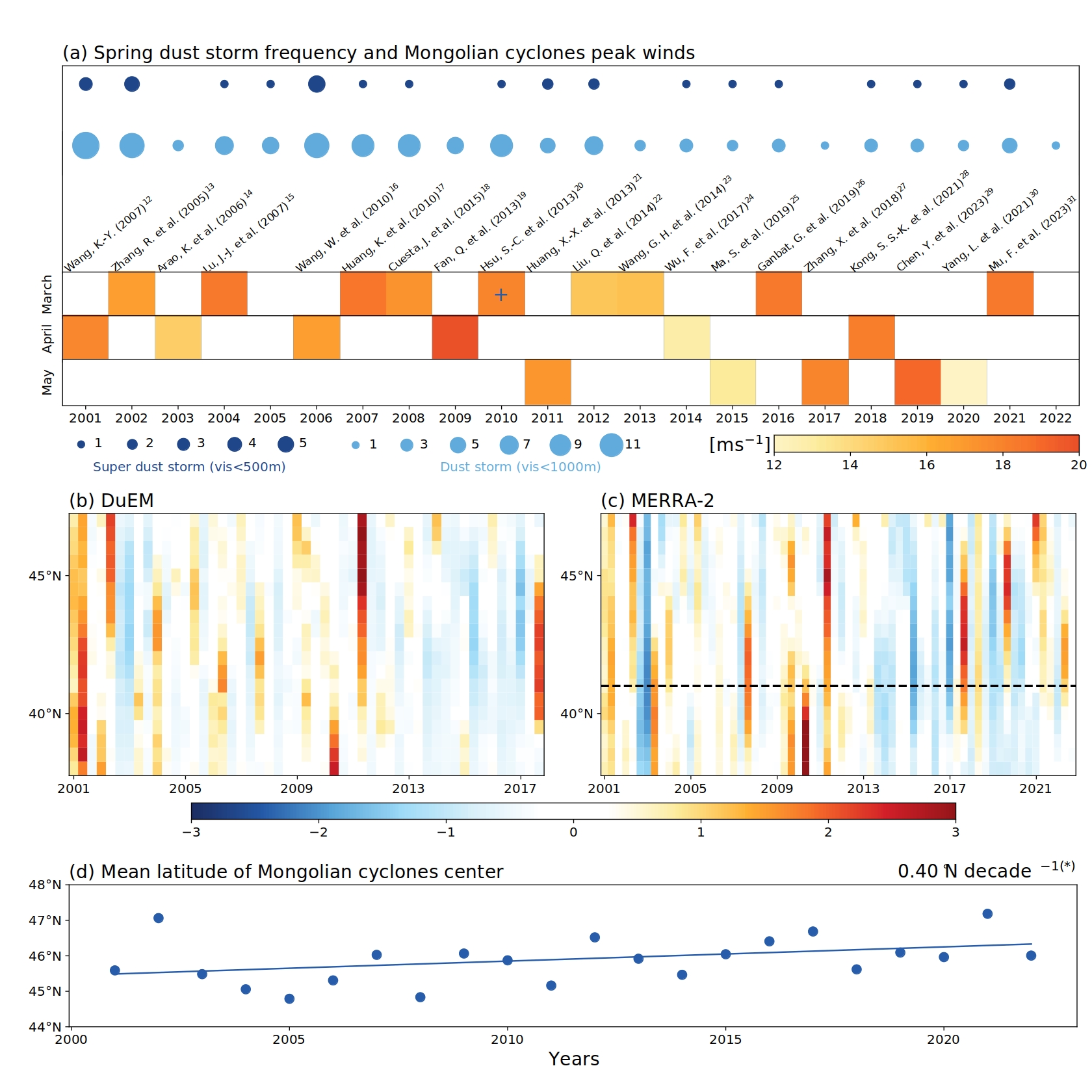 Co-occurrence of Mongolian cyclones and East Asian dust storms in springtime. Show are (a) the number of spring super dust storms and dust storms (including super dust storms) over China and the maximum peak winds of the associated Mongolian cyclone in D2 during individual dust storms as reported by peer-reviewed publications from 2001 to 2022, (b, c) Hovmöller plot of monthly mean dust emission flux anomalies, normalized by the climatological standard deviation, associated with Mongolian cyclones from DuEM (2001–2017) and MERRA-2 (2001–2022) reanalysis, and (d) mean position (latitude) of Mongolian cyclones center per spring and their trends from 2001 to 2022. The occurrences of dust storms are obtained from the China Meteorological Administration measured by in-situ observations of atmospheric visibility across China and validated against past studies addressing the dust storm dynamics. The dust storm event in 2010 is associated with the defined atmospheric depressions with a lifetime of less than 24 h, marked with +. The black dashed line in (c) represents the latitude at 104.5°E and 41°N, located in northern China near the border with Mongolia. (*) in (d) indicates that the statistical significance exceeds the 90% confidence level.