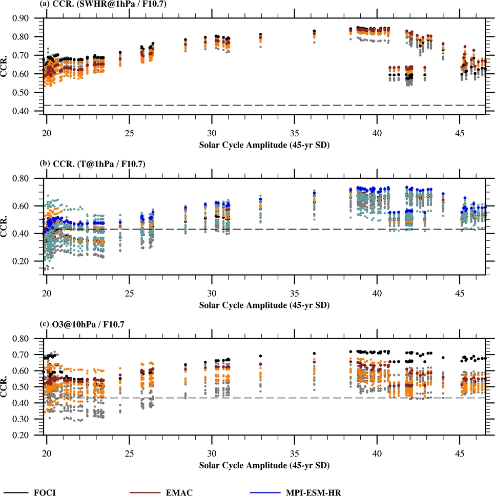 Initial 11-year solar cycle signals in the upper and middle stratosphere vs. the solar cycle amplitude. (a) Scatter plot of correlation coefficients between the annual shortwave heating rate anomalies in the tropical stratopause (averaged over 25° S–25° N at 1 hPa) and the annual F10.7 index in all 45-year running windows vs. the solar cycle amplitude (standard deviations of the annual F10.7 index in all 45-year windows) for FOCI (ensemble mean: black; light gray: individual members) and EMAC (brown: ensemble mean; light brown: individual members) in the FULL experiment. The dashed black line indicates the 95 % significance level. Panel (b) is the same as (a) but for the temperature anomalies at 1 hPa from FOCI, EMAC, and MPI-ESM-HR (blue: ensemble mean; light blue: individual members). Panel (c) is the same as (a) but for the O3 volume mixing ratio anomalies at 10 hPa from FOCI and EMAC.