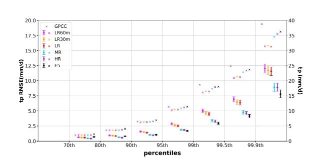 European averaged precipitation amounts and RMSEs (referenced to GPCC) for European total precipitation at different percentile ranges (70th–80th, 80th–90th, 90th–95th, 95th–99th, 99th–99.5th, 99.5th–99.9th, and > 99.9th percentile) in ERA5 (black) and OpenIFS simulations (LR60m: magenta, LR30m: orange, LR: red, MR: blue, HR: purple) during 1982–2019. Cross marks are the precipitation amounts. Dots are the RMSE values, and error bars are the 95 % CI.