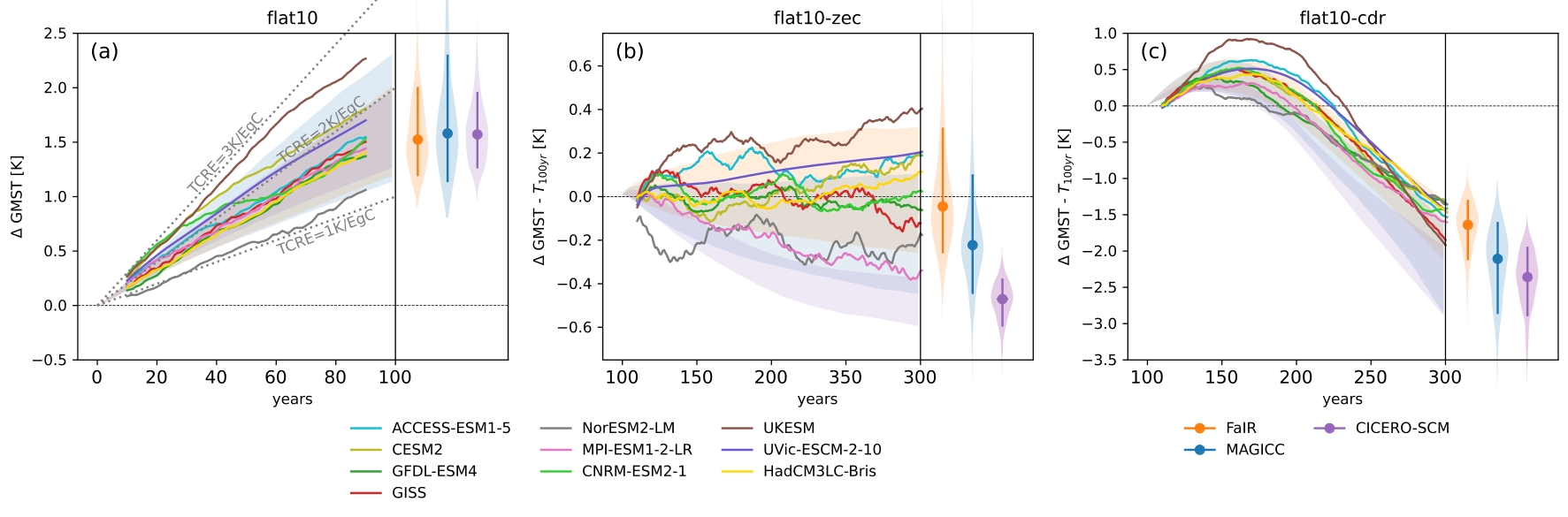 Summary results for global mean surface temperature (GMST) response in the trial flat10MIP. Colored lines indicate temperature change from (a) pre-industrial levels to (b, c) T100 yr (the average temperature in years 91–110 in esm-flat10) in each of the participating ESMs. Shaded regions refer to the simple climate models' probabilistic distribution ranging from the 10th to 90th percentiles. This distribution is shown as violin plots for the last time step of each scenario, where the shading shows the full range of results and the vertical line indicates the 10th–90th percentiles, with the median in the center. A 20-year moving average is applied to all time series.
