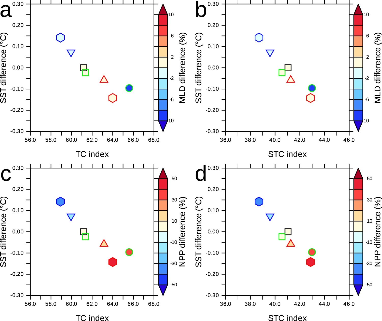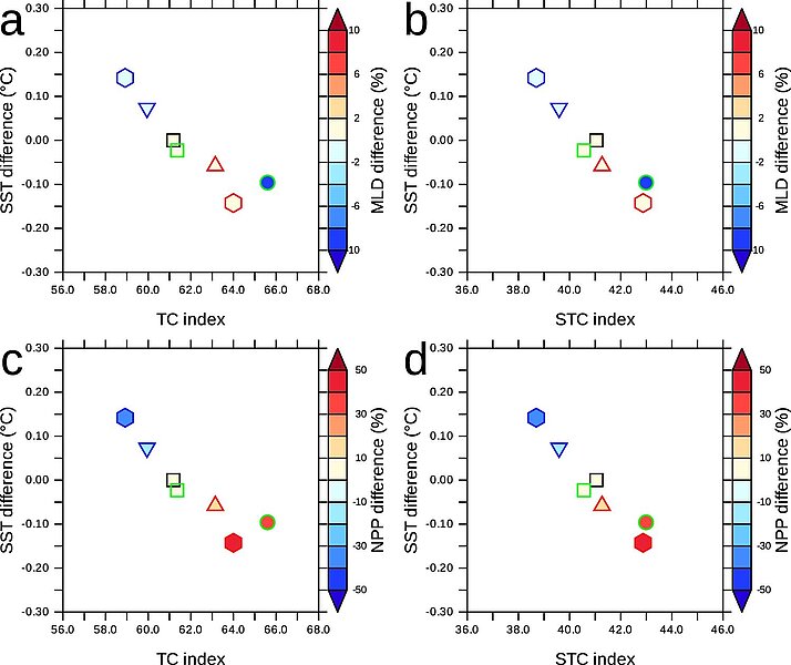 Mean sea surface temperature difference (10°N–10°S) (°C) (compared to GW – Global Warming experiment) vs. Tropical Cells Index (a) and Subtropical Cells index (b). The mixed layer depth (MLD) difference (m) (10°N–10°S) is shown in color for each experiment. c, d Similar to (a, b) but net primary production (NPP) difference (percent) (compared to GW) is shown in color for each experiment.