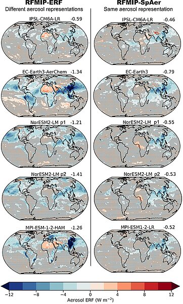 Summary from https://agupubs.onlinelibrary.wiley.com/: "Aerosols are particles in the atmosphere with sizes ranging from nanometers to tens of micrometers, which are emitted by natural and anthropogenic processes or formed from gases in the atmosphere. The extent to which anthropogenic aerosols affect the radiation budget of Earth is important to better understand anthropogenic climate changes. Aerosol effects on the radiation budget are simulated by complex Earth system models that informed the Sixth Assessment Report of the Intergovernmental Panel on Climate Change. Our study addresses why such model experiments show different magnitudes for aerosol radiative effects. The results point to opportunities to further improve models with existing observations of aerosol optical properties and aerosol transport over oceans in addition to the much-studied aerosol effects on clouds."