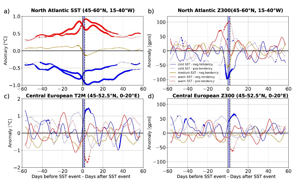 Evolution of cold SST events with negative tendency (solid – blue), with positive tendency (dashed – blue), neutral SSTs with negative tendency (solid – orange), warm SST events with negative tendency (solid – red), with positive tendency (dashed – red) relative to the respective onset date smoothed with a 5–day running mean; the composite mean is shown for a) North Atlantic SST anomalies (15 – 40°W, 45 –60°N), b) North Atlantic Z300 anomalies (15 – 40°W, 45 –60°N), c) European T2m anomalies (0 – 20°E, 45 – 52.5°N), d) European Z300 anomalies (0 – 20°E, 45 – 52.5°N); a thicker line width indicates significance according to the 95% confidence interval based on the bootstrap method.