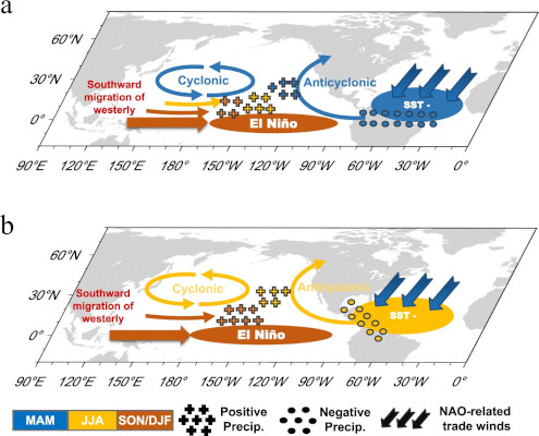 Summary: "The North Tropical Atlantic, through its impacts on the Pacific, is key to tropical climate dynamics and predictability. The drivers of multidecadal changes in the North Tropical Atlantic−Pacific connection are poorly understood. Here it is shown that they are mainly controlled by multidecadal variability associated with the North Atlantic Oscillation."