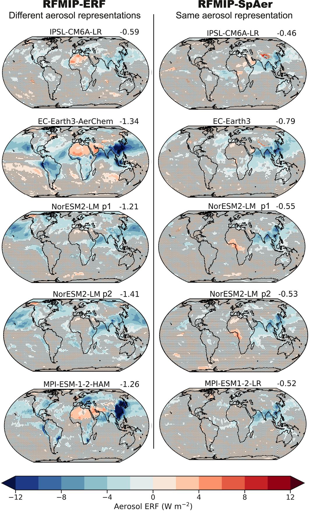 Spatial patterns of the effective radiative effects of present-day anthropogenic aerosols. Shown are (left) a selection of models from RFMIP-ERF against (right) RFMIP-SpAer, based on 30-year-long experiments for the 2014 aerosols (Table S2 in Supporting Information S1). Values in the corner are the global means. Areas without statistically significant values (p-value 0.05) are masked with black dots. All models in RFMIP-ERF are shown in Figure S2 in Supporting Information S1.