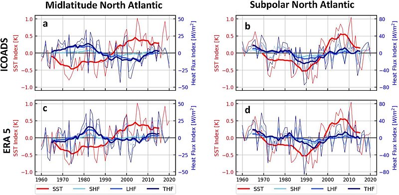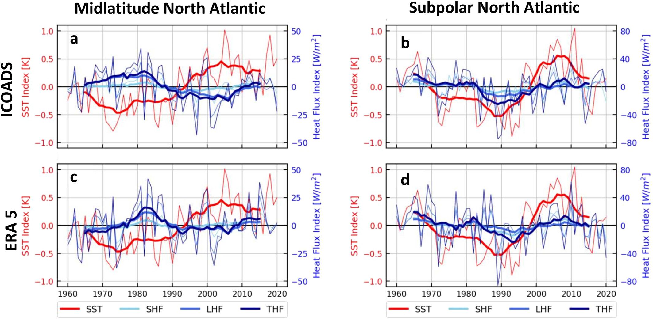 Time series of sea-surface temperature (SST) and turbulent heat flux (THF) indices in the central-midlatitude North Atlantic (NA) (a), (c) and subpolar NA (b), (d). SST (red scale), and sensible (SHF), latent (LHF) and total turbulent heat flux (THF) (blue scale) for ICOADS (a), (b) and ERA5 (c), (d) for JFM means (thin) and 11-year running means (bold). Negative (positive) THF indicates oceanic heat loss (gain). The time series are not detrended.