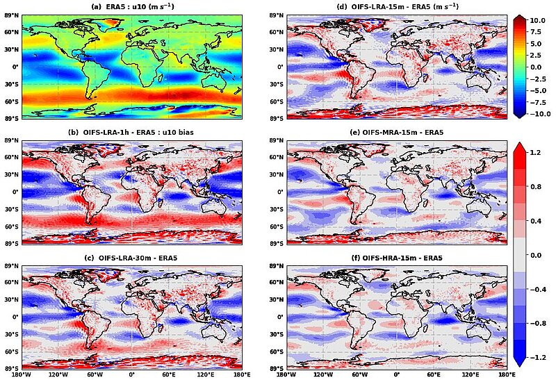 (a) Annual mean ERA5 surface zonal wind [m s−1]. (b–d) Annual mean zonal wind [m s−1] bias for different model time steps (1 h (b), 30 m (c), and 15 m (d)) using ∼ 100 km resolution and (e, f) with different horizontal resolutions (∼ 50 (e) and ∼ 25 km (f)). Biases are computed with respect to ERA5 over the period 1979–2019.