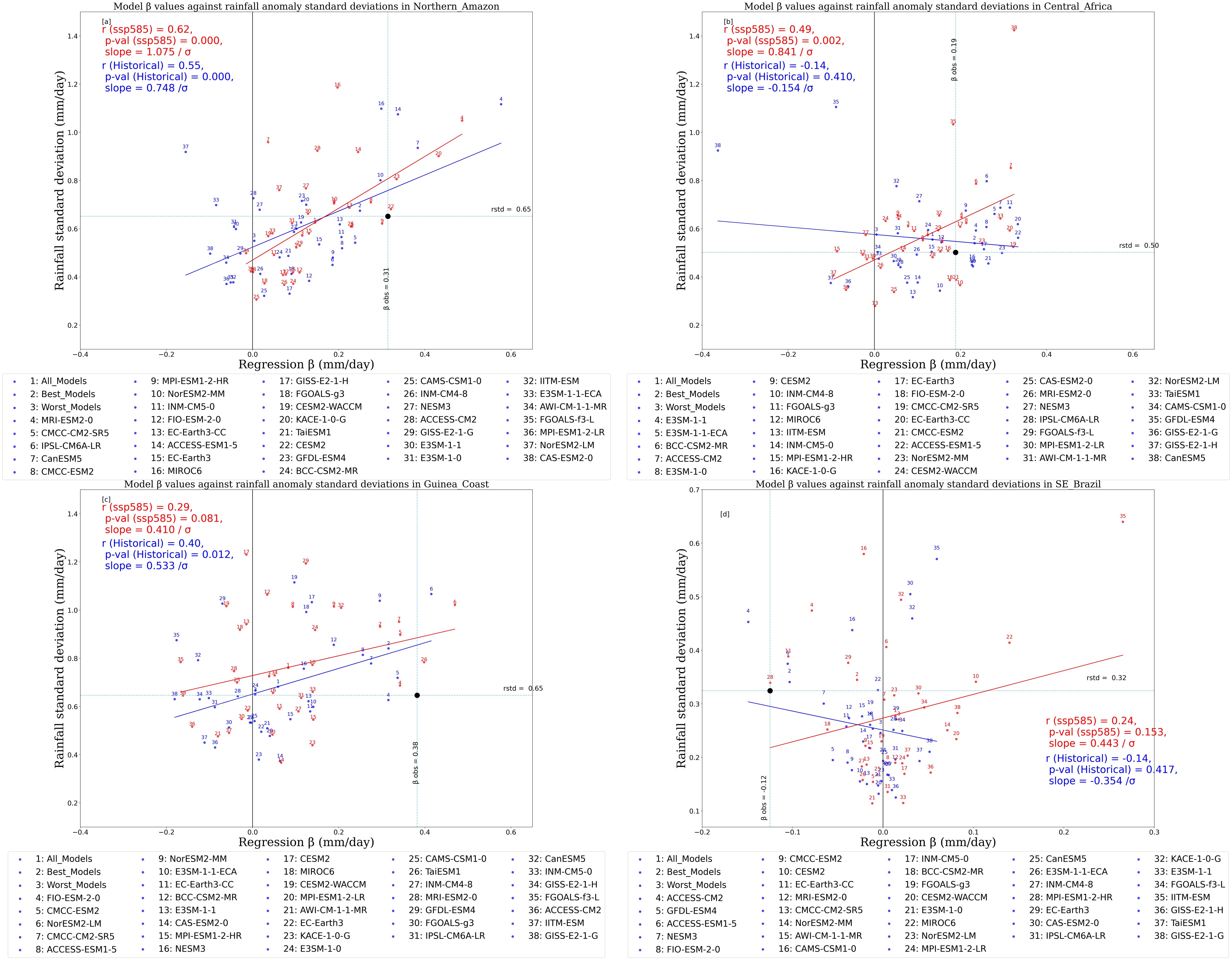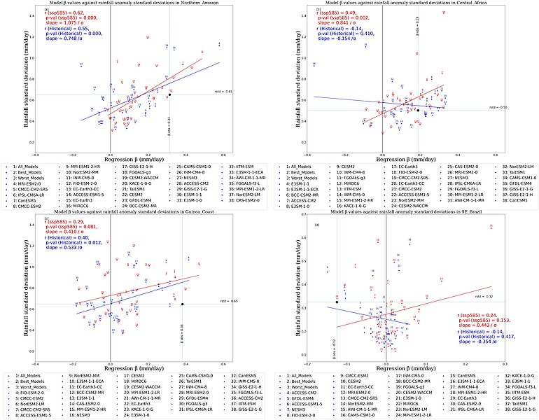 SAOD influence on rainfall as a predictor of the total rainfall variability in historical (blue) and SSP585 (red) over (a) Northern Amazon, (b) Central Africa, (c) Guinea Coast, and (d) Southeast Brazil. The blue (red) data points and regression lines represent model historic (SSP585) scenarios. The black dots show the observations while the skyblue dotted lines indicate the Observations regression β (horizontal) and rainfall variability (vertical) values.