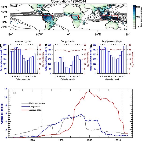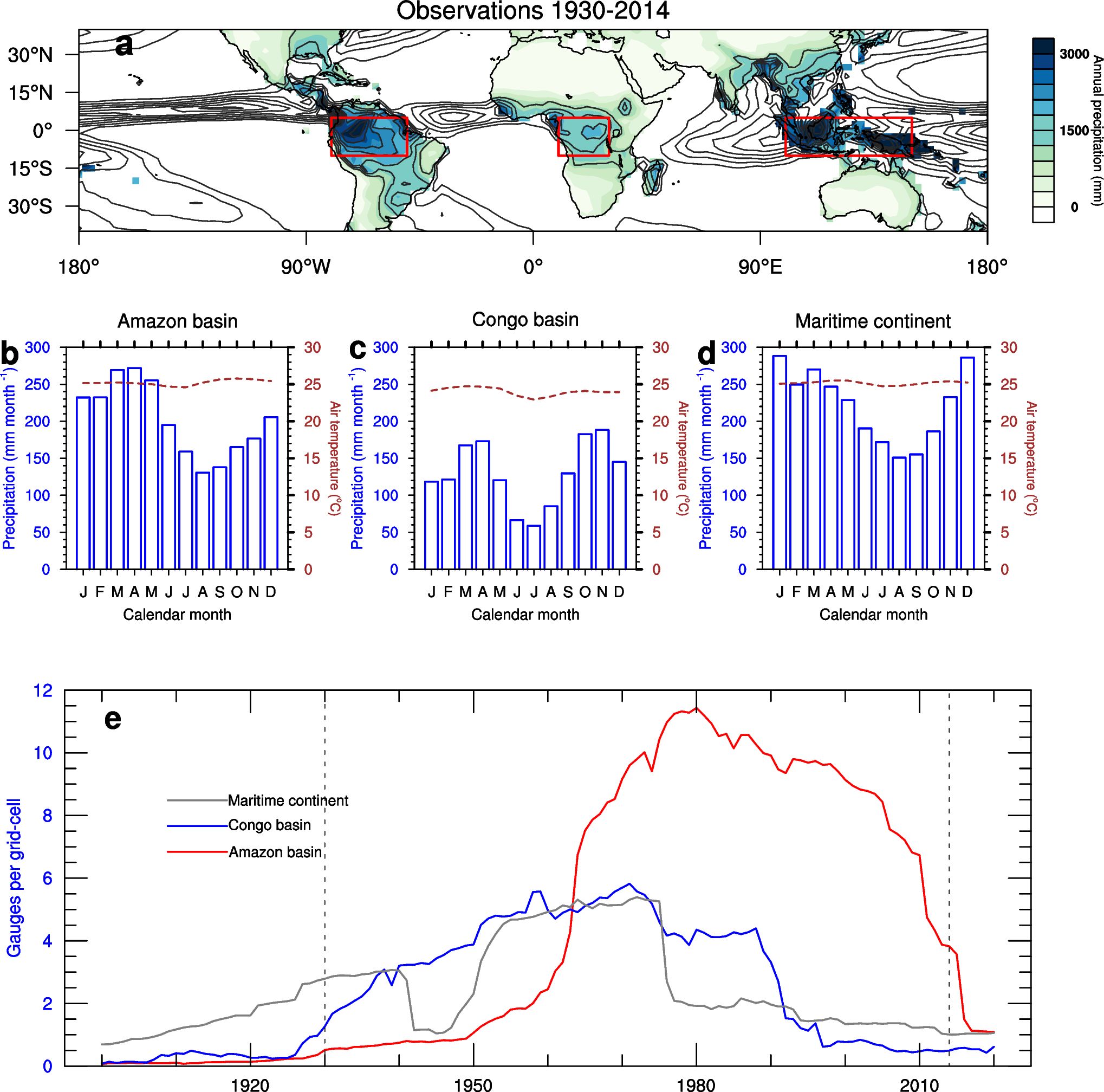 a Mean annual precipitation from GPCC 1930–2014, whereas the contours show the monthly-mean precipitation rates in mm day–1 from the GPCP satellite-derived dataset 1979–2014 (only values of 3 mm day–1 are contoured at the interval of 1 mm day–1). b–d (left axis) annual cycle of land precipitation (bar plots) averaged over the Amazon basin (5° N–10° S, 50–80° W), Congo basin (5° N–10° S, 10–30° E), and Maritime continent (5° N–10° S, 100–150° E) shown by the red boxes in a. The right axis in b–d shows the annual cycle of 2-m air temperature represented by the dashed line. e Number of rain gauges within a grid-cell averaged over the Amazon basin (red), Congo basin (blue), and Maritime continent (grey). Dashed vertical lines in e delineate the study period 1930–2014. Note that for the area-average over the humid tropic regions, only land grid points included to the boxes are considered