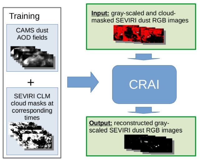 Schematic illustration of this study's set-up. This study relies on the publicly available climatereconstructionAI (CRAI) code (blue box). To train the CRAI we use a combination of dust aerosol optical depth fields provided by Copernicus Atmosphere Monitoring Service and the Meteosat Second Generation-Spinning Enhanced Visible and Infrared Imager (SEVIRI) cloud mask product CLM provided by EUMETSAT (gray-framed box). Once trained, we provide gray-scaled images, we derived from the SEVIRI Dust RGB product, combined with the corresponding cloud mask as input (upper green box). The CRAI provides reconstructed gray-scaled images, in which cloud-masked pixels have been in-painted as output (lower green box).