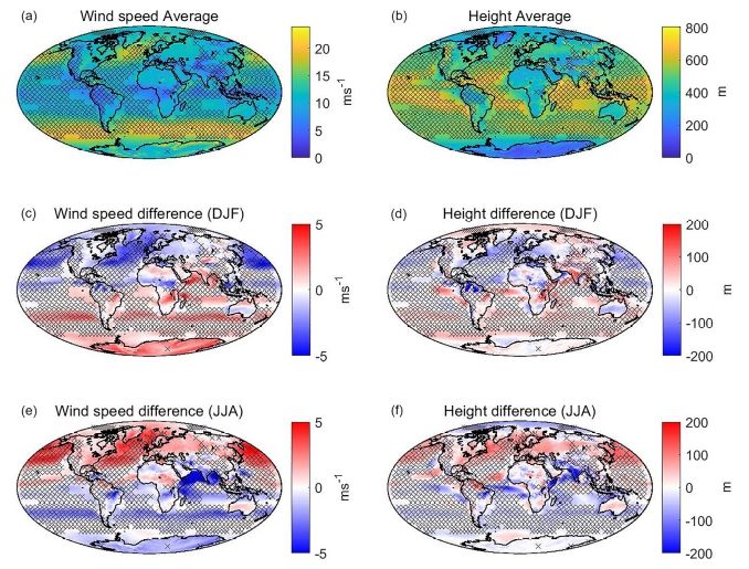 Spatial patterns of LLJ characteristics. Shown are the averages of the (a) wind speeds and (b) heights in the core of LLJs calculated as composite means over all detected LLJs, and (c–f) the differences in the characteristics in the mean for December, January, and February (DJF), and for June, July, and August (JJA) relative to the annual means shown in (a) and (b). The dashed areas mask regions where the LLJ frequency of occurrence was smaller than 15%. The results are based on ERA5 for 1992–2021.