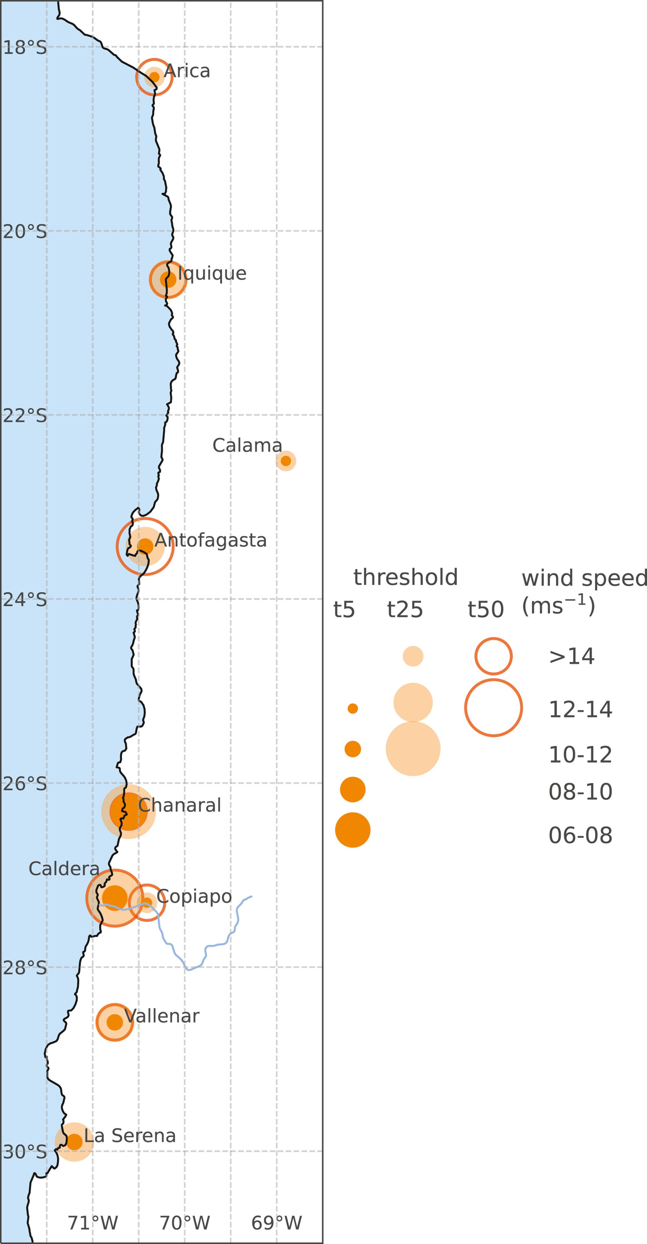 Abstract: Little is known about the dust activity in the Atacama Desert in Chile. Our study provides the first assessment of dust events in the past 72 years using dust and meteorological observations from stations in the Atacama. Dust activity is low but we found three periods in the past with more dust activity than today, possibly linked to past changes in soil conditions. The minimum wind speeds required for dust events are much higher than those previously determined for North African and East Asian Deserts, consistent with the rareness of large dust outbreaks from the Atacama.