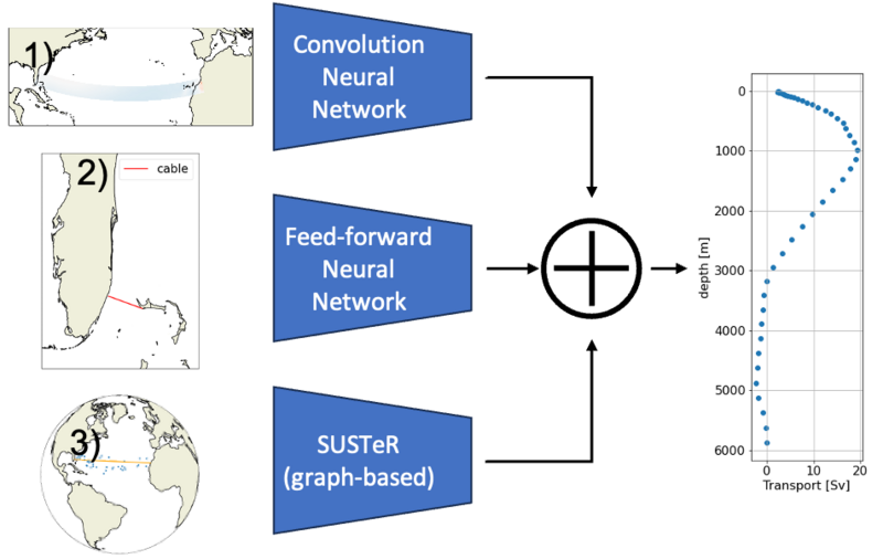 In den letzten Jahren hat das maschinelle Lernen (ML) die numerische Wettervorhersage verändert und durch datengesteuerte Modelle sowohl die Effizienz als auch die Genauigkeit verbessert. Am GEOMAR entwickeln wir effiziente Emulatoren für Meereis und Ozeandynamik, die stabile, langfristige Klimasimulationen bei drastisch reduzierten Rechenkosten ermöglichen sollen - und damit den Weg für digitale Zwillinge des Ozeans ebnen. Zusätzlich zu rein statistischen Ersatzmodellen konzentriert sich unsere Arbeit auf die Entwicklung hybrider numerischer ML-Modelle, die traditionelle physikalische Simulationen mit der Flexibilität und Anpassungsfähigkeit des maschinellen Lernens verbinden. Dieser flexible Rahmen ermöglicht es uns, einzelne physikalische Komponenten durch vereinfachte, interpretierbare Modelle des maschinellen Lernens zu ersetzen, was eine einzigartige Möglichkeit bietet, neue physikalische Erkenntnisse aus Beobachtungsdaten zu gewinnen. Darüber hinaus entwickeln wir ML-basierte Parametrisierungen für ozeanische Prozesse und statistische Modelle für die Vorhersage und Ableitung wichtiger Klimaindizes, wie z. B. die Atlantische Meridionale Umwälzzirkulation (AMOC).
