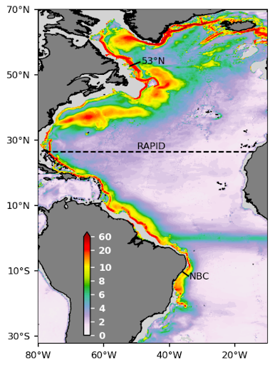 Der mit der AMOC verbundene nordwärts gerichtete Wärmetransport ist für das Klima im Nordatlantik von entscheidender Bedeutung, und ihre mögliche Schwächung durch die globale Erwärmung ist Teil einer intensiven Debatte. Die Forschung der Einheit Ozeandynamik trägt zu einem tieferen Verständnis der AMOC bei, indem wir die Variabilität auf saisonalen bis dekadischen Zeitskalen und das Potenzial zur Überlagerung langfristiger Trends analysieren. Dazu gehören auch die Auswirkungen von Wärmeflüssen an der Oberfläche und Änderungen des Süßwasserhaushalts. Unsere hochauflösenden Simulationen werden für Studien in Kombination mit Beobachtungen und Lagrangeschen Methoden verwendet und tragen zu multinationalen Modellvergleichen bei.