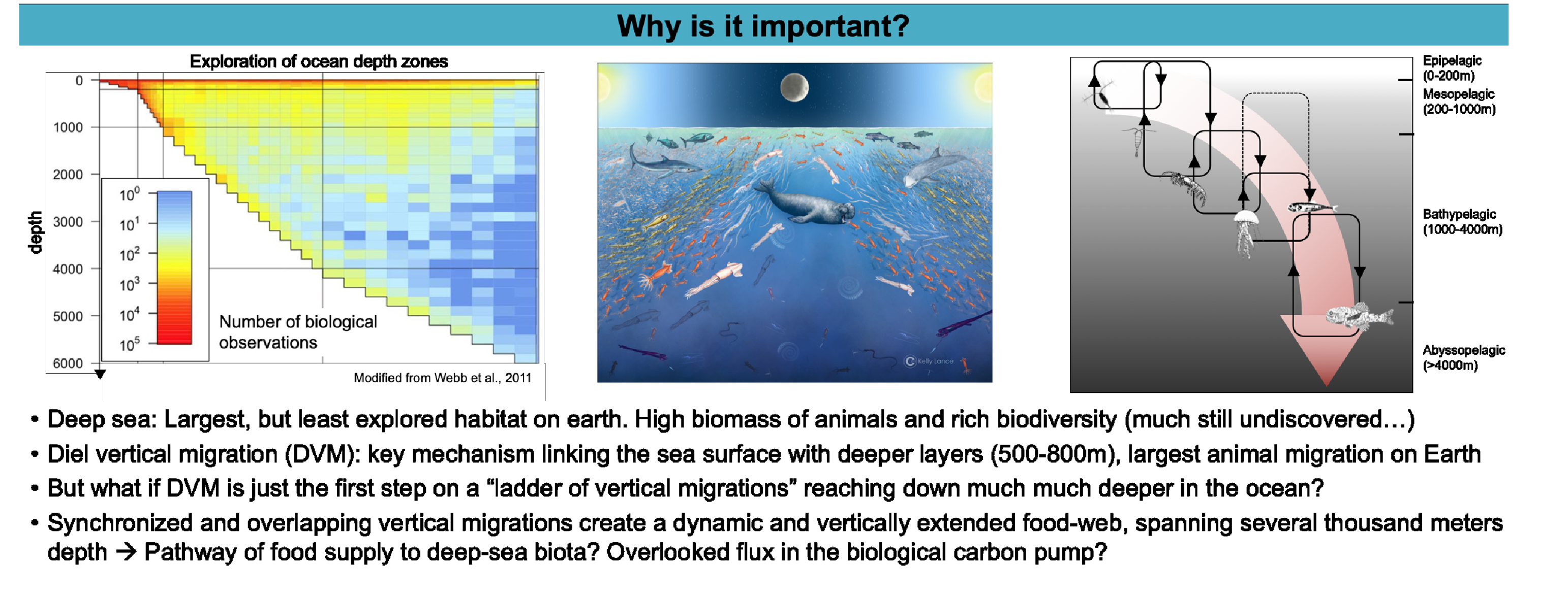 •Hypothesis: synchronized and inter-linked vertical migrations of a multitude of species connect food-webs across the entire oceanic water column down to several thousand meters depth