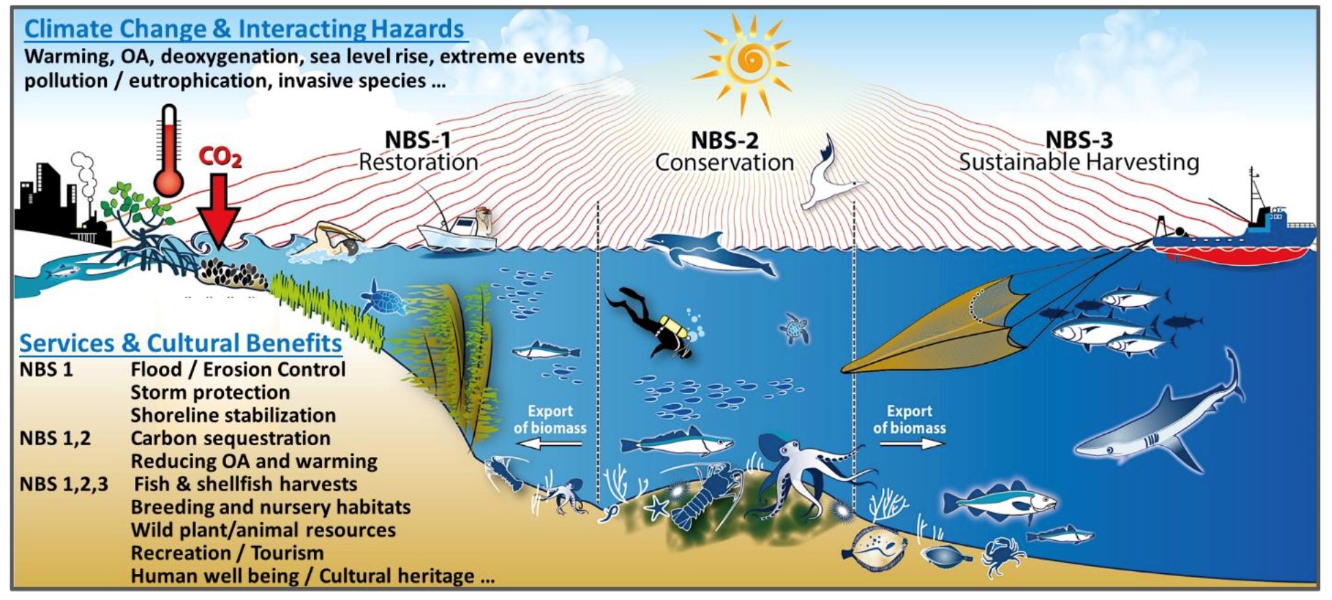 Abbildung 1: Die drei natürlichen Lösungen (NLs), die in FutureMARES weiterentwickelt werden, um klimaresistente Schutzmaßnahmen, die Anpassung und Abmilderung von Klimafolgen und anderer interagierender Gefährdungen durch Erhalt und Verbesserung der Biodiversität, des natürlichen Kapitals und der Ökosystemdienstleistungen sowie des kulturellen Nutzens auch in Zukunft zu gewährleisten. OA = Ozeanversauerung. NBS1 (=NL1): Kontrolle von Fluten und Erosion, Schutz gegen Stürme, Stabilisierung der Küstenlinie. NBS2 (=NL2): Kohlenstoffablagerung, Reduktion von OA und Ozeanerwärmung. NBS1,2,3 (=NL1,2,3): Fisch- und Krebstierfang, Brut- und Aufzuchthabitate, Biodiversität an Pflanzen und Tieren, Erholung, Tourismus, menschliches Wohlbefinden, kulturelles Erbe.
