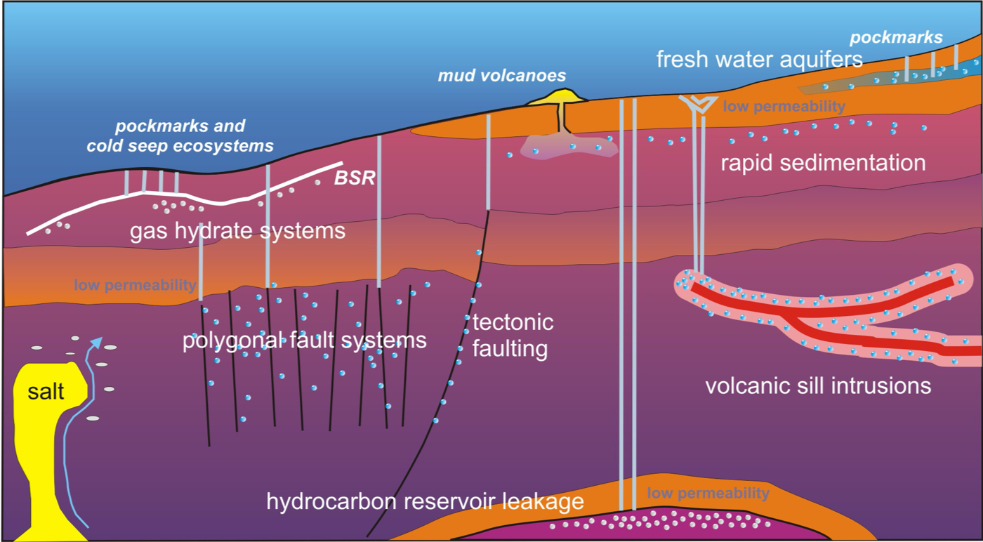 Die Sedimente an den Kontinentalrändern sind vielen geologischen Prozessen ausgesetzt. Fluide werden aus den sich verdichtenden Sedimenten ausgepresst, Gashydratsysteme verlagern sich in Abhängigkeit von Bodenwassertemperaturschwankungen und durch magmatische Intrusionen erhitztes Porenwasser fließt durch die Sedimente zur Oberfläche. Die Fluide, die durch solche fokussierten Fluidtransportsysteme am Meeresboden austreten, spielen nicht nur eine bedeutende Rolle für die Meeresbodenökologie. Das Studium solcher Fluidtransportsysteme kann auch dazu beitragen, die Verteilung von Kohlenstoffen im Meeresboden vorherzusagen und frühere Klimaveränderungen zu entschlüsseln.