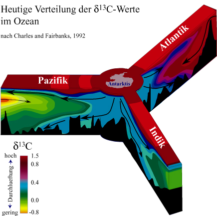 Da die globalen Schwankungen im δ13C allen δ13C Kurven gleichermaßen (als Minimalausschlag) registriert werden, geben regionale Unterschiede im δ13C Wert des Tiefenwassers darüber hinaus Hinweise auf unterschiedliche Wassermassen und ihre horizontale und vertikale Ausbreitung. So wird einer Wassermasse mit zunehmender Enfernung von ihrem Bildungsort ständig leichtes 12C durch Oxidation von organischem Material zugeführt ("Alterungsprozeß"). Die δ13C Werte ermöglichten damit erstmals einen tiefen Einblick in die Geschichte der primären Wassermassen des Weltozeans, nämlich das Nordatlantische Tiefenwasser (NADW) und das Antarktische Bodenwasser (AABW). Veränderungen in den Produktionsraten dieser Wassermassen und ihrer Vermischung bestimmen letztendlich die Tiefenwasserdurchlüftung (siehe Abbildung) sowie die daran gekoppelte Nährstoffverteilung im Ozean und beeinflussen damit letztendlich den globalen CO2-Haushalt.