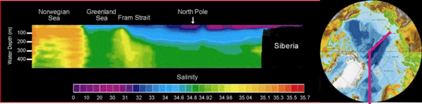 Wichtige Faktoren der arktischen Umwelt sind der Einstrom warmen und salzreichen Atlantischen Wassers und der Einfluss der kalten und salzarmen Halokline (Salzgehaltssprungschicht). Der arktische Flusswasserausstrom (10% des globalen Flusswassers) und die damit zusammenhängende salzarme Halokline (siehe Abb. 1) isoliert normalerweise die Meereisdecke von dem darunterliegenden warmen, salzreichen Atlantischen Wasser. Im Rahmen der derzeitigen Erörterung des arktischen und globalen Klimawandels wurde inzwischen erkannt, dass das Vorhandensein der arktischen Halokline - mit ihren isolierenden Eigenschaften - nicht mehr als selbstverständlich angenommen werden kann. Die arktische Halokline wird größtenteils durch den Zustrom aus den arktischen Schelfgebieten gespeist. Die Schelfgebiete liefern Süßwasser (Flusswasser) und durch Meereisbildung salzangereichertes Wasser (Brine-Wasser). Durch die starken Änderungen der Meereisbedeckung in der Arktis und gerade auf den Schelfgebieten ist es bislang eine weitgehend offene Frage, ob die Halokline weiterhin ein stabiles und permanentes Phänomen bleibt. Ohne eine Antwort ist es nicht möglich zufriedenstellende Vorausberechnungen zum arktischen und globalen Klimawandel zu erstellen. Zur Beantwortung dieser Frage untersuchen wir (1) den Austausch von Süßwasser und Brine-Wasser zwischen Schelfgebieten und Ozeanbecken entlang des Eurasischen Kontinentalrandes (Eurasian Margin Freshwater Exchange (pdf)) und die Zusammensetzung der Süßwasserquellen und den Beitrag von Pazifischen Wasser in der Transpolaren Drift im Zentralen Arktischen Ozean (Impact of Arctic Freshwater (pdf)) (2) Außerdem untersuchen wir die Veränderungen der Meereis-Prozesse auf den Arktischen Schelfgebieten in Bezug auf die Arktische Halokline (siehe Teilprojekt 3A im Deutsch-Russischen “Transdrift” https://www.transdrift.info/). Dabei wird der Einfluss des Süßwassers und der Brine-Wässer von den Schelfen mithilfe von hydrographischen Daten und stabilen Isotopen Untersuchungen in der Wassersäule quantitativ bestimmt (Background Information on Methods (pdf)).