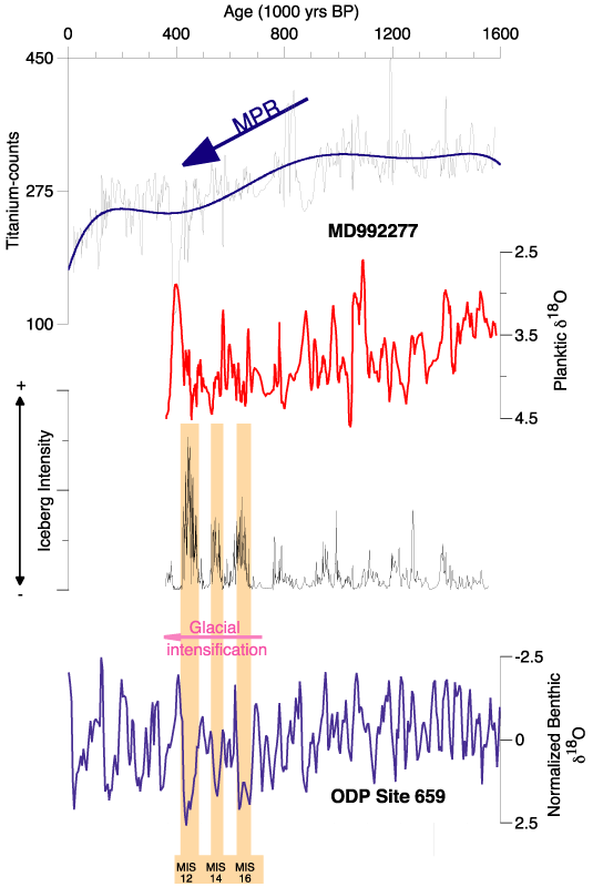 Eine Reihe wesentlicher neuer Erkenntnisse konnte gewonnen werden. So zeigten sich z.B. regionale Unterschiede in der Ausprägung interglazialer Klimate zwischen subpolarem und polarem Nordatlantik: Der hohe Norden war in den vergangenen 450.000 Jahre nur durch 3 ausgeprägt warme Intervalle gekennzeichnet, während solche Bedingungen im subpolaren Sektor häufiger auftraten (Abb. 1b). Für die nördliche Hemisphäre konnte darüber hinaus eine deutliche Intensivierung der glazialen und interglazialen Bedingungen im Zuge der pleistozänen Klimarevolution (MPR) nachgewiesen werden (Abb. 2).