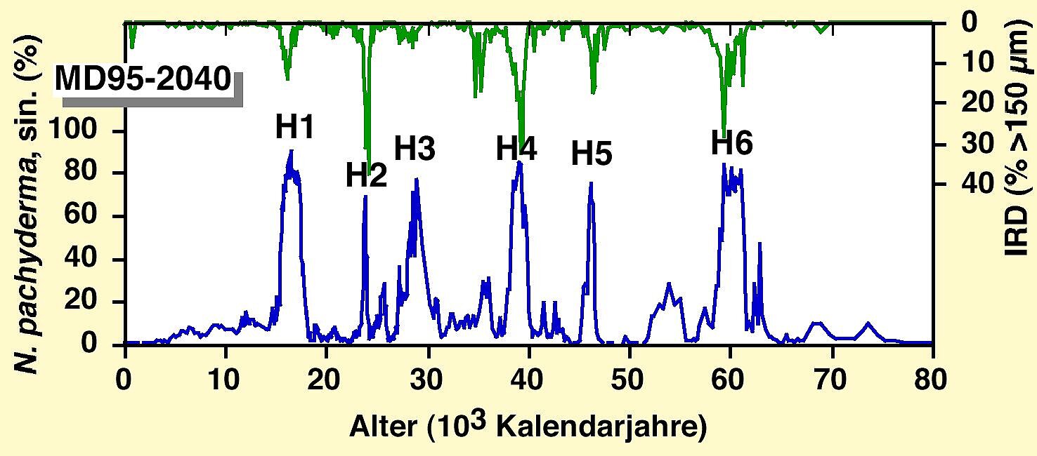Heinrich-Ereignisse sind kurze Perioden mit Eisberg-Triften und Schmelzwasserschüttung vom Laurentidischen Eisschild die während der Glazialzeiten auftraten. Eisberg-Häufigkeiten und der Schmelzwasser-Einfluss war an stärksten in einem breitenparallelen Band zwischen 40° und 50°N (Bond et al., 1992; Bond and Lotti, 1995). Die Schmelzwässer erniedrigten Oberflächenwasser-Temperaturen und Salinitäten, und destabilisierten bzw. unterbrachen damit die thermohaline Zirkulation im glazialen Nordatlantik (Zahn et al., 1997). Heinrich Ereignisse zeichnen sich durch ein massives Vorkommen von polaren planktonischen Foraminiferen (Neogloboquadrina pachyderma, sinistral) und von groben, terrigenen Eisbergschutt-Partikeln aus Nordamerika aus (Baas et al., 1997, de Abreu et al., 2003). In Sedimentkernen werden diese Intervalle als "Heinrich-Lagen" bezeichnet. Sie können für eine chronostratigraphische Einstufung der Kerne genutzt werden (Lebreiro et al., 1996, Schönfeld und Zahn, 2000).