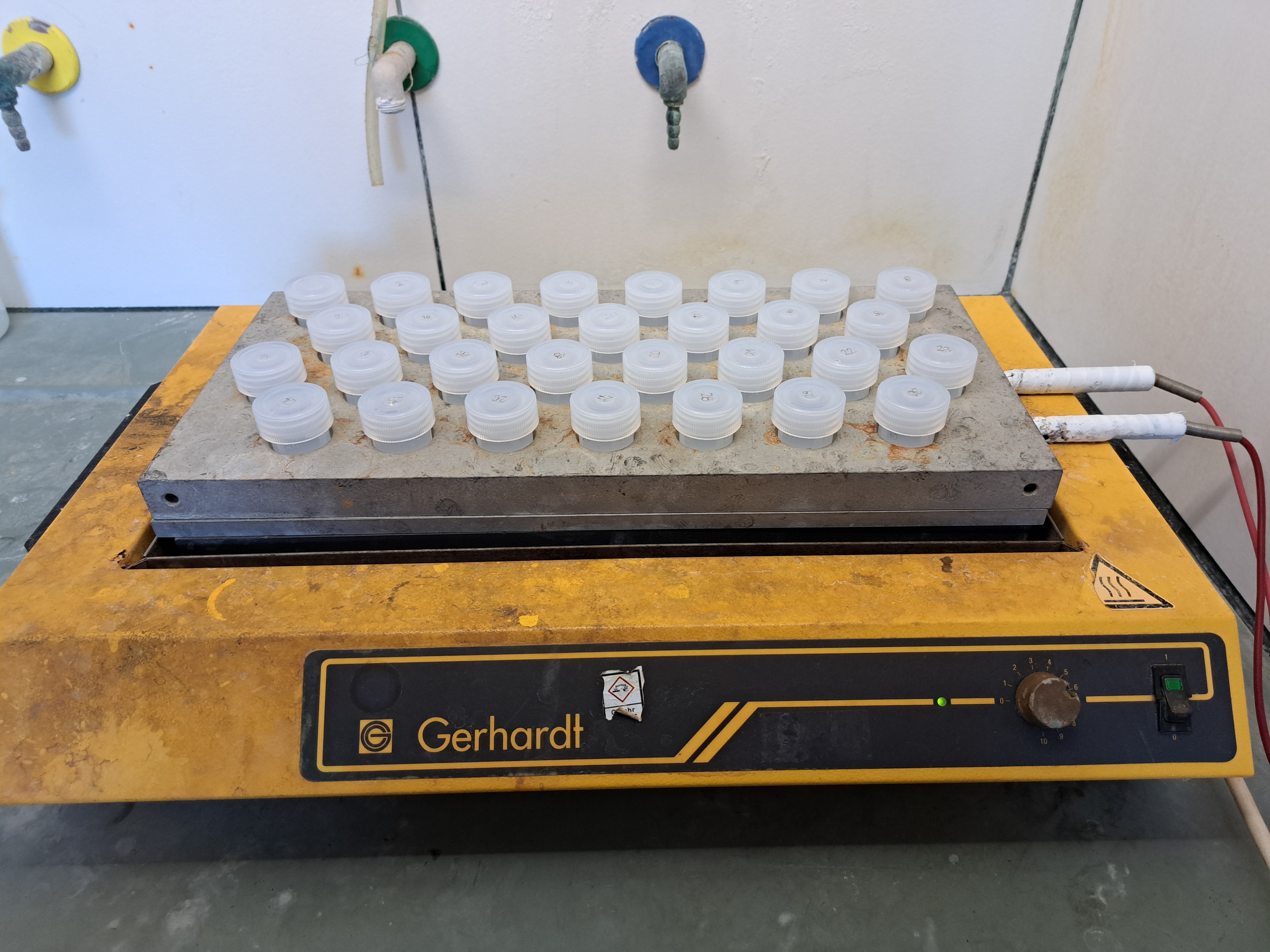 Tiegel von der Heizplatte nehmen, abkühlen lassen und vorsichtig öffnen. Offene Tiegel auf die Heizplatte (190°C) stellen und die Säuren bis kurz vor der Trockene* abrauchen. Auch die Deckel kurzzeitig auf die Heizplatte legen (Oberseite nach unten), um Säurereste abzurauchen.