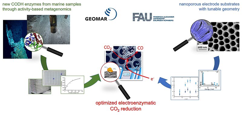 Enzyme, biologische Katalysatoren, weisen häufig Selektivitäten oder Aktivitäten auf, die von den industriell verwendeten, heterogenen Katalysatoren nicht erreicht werden. Einige Enzyme können aus kultivierten Mikroben extrahiert und in der biochemischen Verfahrenstechnik eingesetzt werden. Ein enormes enzymatisches Potenzial bleibt jedoch ungenutzt, da die mikrobielle Mehrheit derzeit nicht kultivierbar ist. Dieses Projekt zielt darauf ab, auf diese bisher unerschlossene biologische Ressource zuzugreifen und die enzymatische elektrokatalytische Aktivität von CODH-Enzymen (CO-Dehydrogenasen) aus marinen Habitaten zur Reduktion von CO2 (Kohlendioxid) zu CO (Kohlenmonoxid) zu demonstrieren. Dazu sollen die Enzyme auf nanostrukturierten Elektrodenoberflächen immobilisiert werden. Es sollen neuartige Methoden für aktivitäts-basiertes Durchsuchen von metagenomischen Umweltproben mit modernen Technologien zur Optimierung von Elektrodenoberflächen über Designer-Nanoporosität kombiniert werden. Das Projekt umfasst die folgenden Schritte: (a) Entwicklung eines aktivitäts-basierten Screens, um bisher unzugängliche CODHs aus Umweltproben zu identifizieren und zu nutzen; Charakterisierung und Optimierung biochemischer Eigenschaften der neuen CODHs (GEOMAR); (b) Entwicklung von nanoporösen Elektroden mit großen spezifischen Oberflächen und adäquater Oberflächenchemie für Enzymimmobilisierung (FAU); (c) Optimierung der bioelektrochemischen CO2 Reduktion (GEOMAR + FAU). Die Anwendung der CODH Enzyme in elektrochemischen Zellen ermöglicht (i) die Reduktion des anthropogen verursachten Abgases CO2, (ii) die gleichzeitige Produktion von Ausgangsstoffen, die für chemische Syntheseprozesse benötigt werden sowie (iii) die simultane Speicherung in chemischer Form von elektrischer Energie. Diese einzigartige Kombination von vorteilhaften Funktionen stellt ein Sprungbrett zu einer erneuerbaren Ökonomie basierend auf biologischen Ressourcen dar.