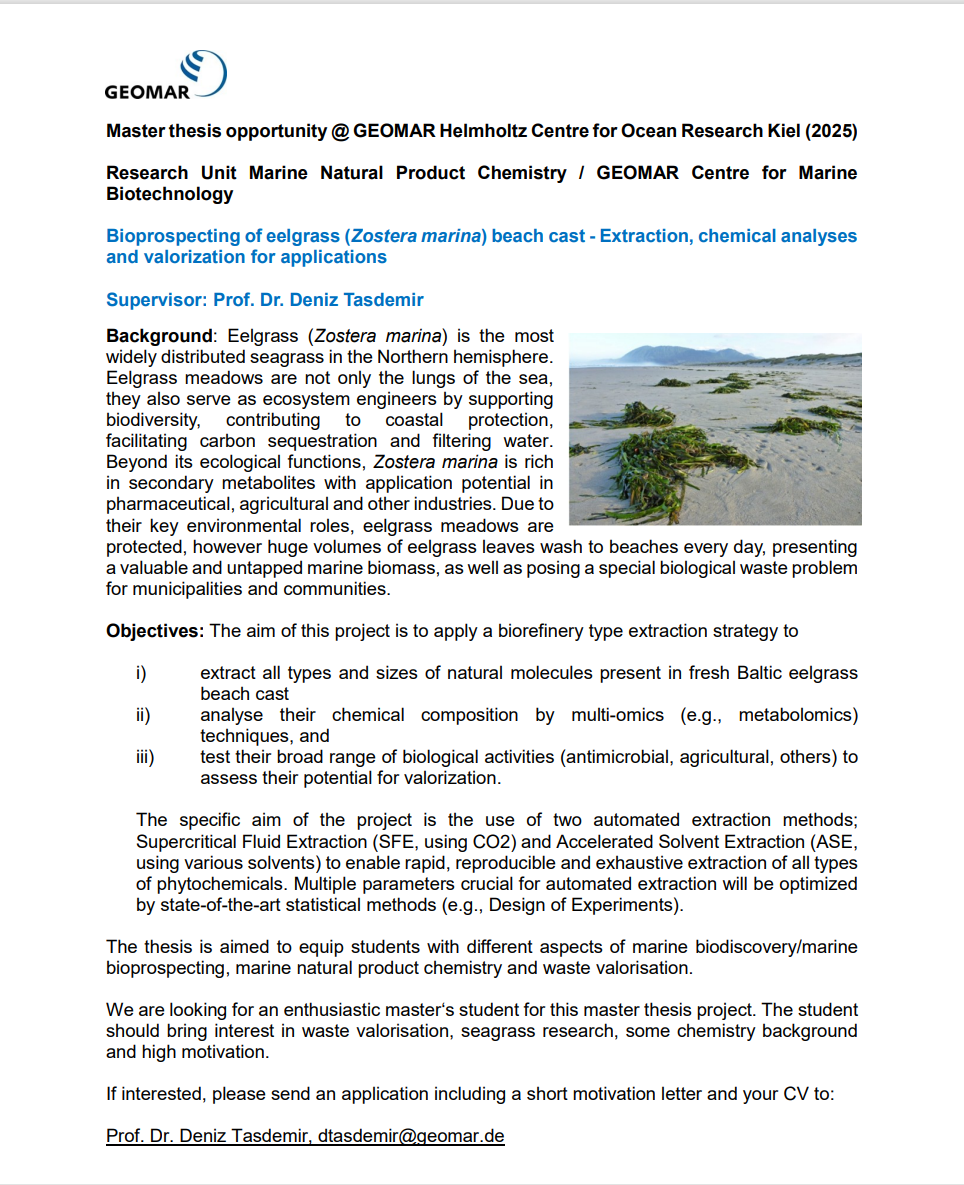Unsere Studienorganismen reichen von marinen Makrophyten (Algen, Seegräser) bis hin zu Meerestieren (Schwämme, Seescheiden, Fische) und der dazugehörigen Mikrobiota. Ein Hauptinteresse gilt den extremophilen Organismen (die in der Tiefsee und in hydothermischen Schloten gedeihen), die aufgrund ihrer biochemischen Anpassungen an diese einzigartigen Umgebungen noch nie dagewesene chemische Gerüste produzieren.