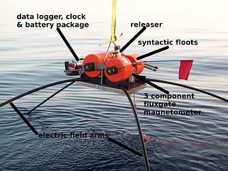 In this type of experiments OBEM stations measure the natural variations of the earth's electromagnetic fields at long periods (0.1 ¨C 10,000s), which allows the detection of resistivity anomalies down to depths of several 10s of kilometers. Marine MT has been successfully employed in various settings and different depth scales to image partial melt zones in the crust and mantle along mid ocean ridges (e.g. Jegen and Edwards, GRL, 1998; Evans et al., 2005) and potentially oilbearing reservoirs covered by basalt and salt layers (Hoversten et al., 2000). The OBEM system of GEOMAR was successfully used in an MT experiment to image the fluid cycles of the Costa Rican subduction zone (s. Worzewski et al., 2011). - Controlled source electromagnetic (CSEM) measurements:
