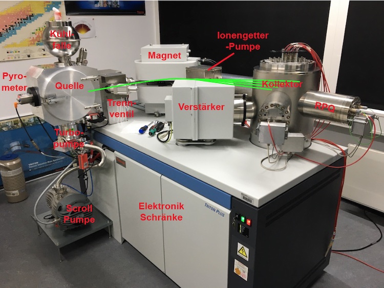 Vor der TIMS Analyse müssen die Elemente von Interesse im Reinraumlabor mit Hilfe von chromatographischen Verfahren von der Probenmatrix getrennt und aufgereinigt werden. Proben werden auf Rhenium-Filamente geladen, auf einem Magazin befestigt und in das Quellengehäuse des TIMS eingesetzt. Die Quelle wird 6 bis 12 Stunden abgepumpt, bis ein Vakuum von 1x10^-7 bis 10^-8 hPa erreicht und Filamente durch elektrischen Strom aufgeheizt werden können. Abhängig vom Ionisierungspotential von Elementen werden unterschiedliche Ströme respektive Temperaturen für die Ionisierung benötigt. Pb+, Sr+ und Nd+ benötigen jeweilig 1180-1240°C, 1350-1450°C and 1600-1800°C zur Ionisierung. In der Ionenquelle werden die Ionen über ein 10kV Potentialgefälle auf eine einheitliche Geschwindigkeit beschleunigt und durch Potentiallinsen ein fokussierter Ionenstrahl erzeugt, der dann in den Hochvakuum-Analysator (~3x 10^-9 hPa) des MS überführt wird. Dort tritt der Ionenstrahl in ein stabiles Magnetfeld, das die Ionen basierend auf Masse und Ladung auftrennt. Mit anderen Worten: Nachdem die Ionen das Magnetfeld passiert haben, ist aus dem Ionenstrahl ein Fächer massenspezifischer Ionen geworden. Bspw. wird ein Sr-Ionenstrahl in die Massen der vier natürlich vorkommenden Sr-Isotope 84, 86, 87 und 88 aufgetrennt. Die massenspezifischen Ionen werden final in Faraday-Cups gesammelt, wo sie ein elektrisches Signal erzeugen. Faraday-Cups bestehen in ihrem Kern aus Graphitschalen, in denen die Ionen elektrisch neutralisiert werden, sodass ein sehr kleiner Fluss an Elektronen im Bereich von 0.001 bis 50x 10^-11 A entsteht. Dieser Strom wird über hochohmige Verstärker (üblicherweise 10^11 Ω) abgeleitet und dabei elektrische Spannung (V = Ω x A) erzeugt, die von der Steuerungssoftware verarbeitet wird. Die Höhe der erzeugten Spannungen für die einzelnen Massen spiegelt dabei unmittelbar die Verteilung der Isotopenhäufigkeit eines Elements wider. Da die Signalintensitäten der verschiedenen Isotope eines Elements gleichzeitig im Faraday Multikollektor gemessen werden, ist das gemessene Massenverhältnis von bspw. 87/86 nichts anderes als der Quotient der elektrischen Spannungen von Masse 87 und 86. Hört sich trivial an; die Ionenströme werden jedoch ultrapräzise gemessen, sodass sich Unterschiede in der Isotopenhäufigkeit mit weniger als ≤0.0008% 2SE Messfehler für 87Sr/86Sr und 143Nd/144Nd sowie ≤0.005% 2SE Messfehler für Pb-Isotopenverhältnisse auflösen lassen.