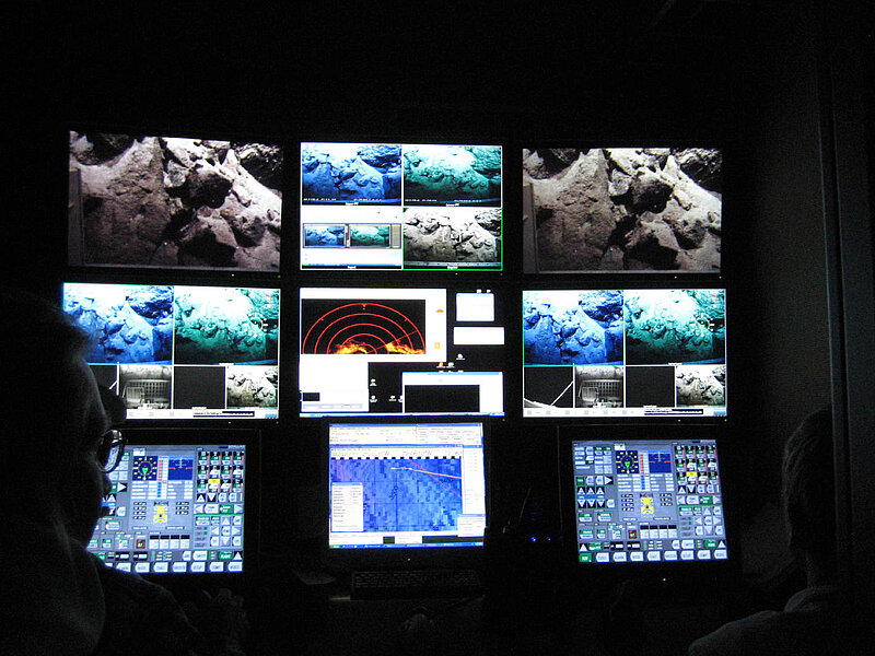 Holzplanken gehe ich zum hinteren Ende des Schiffs, wo zwischen verschiedenen rotgestrichenen Kränen und Seilwinden der ROV-Kontrollcontainer steht. Hier melde ich mich draussen, vorm Container, über Funk als Ablösung an. Eine Bestätigung knistert undeutlich durch das Walkie-Talkie, ich öffne die Tür und trete stolpernd in einen schwarzen, kühlen Raum. Nachdem sich meine Augen einigermaßen an die Dunkelheit gewöhnt haben überkommt mich das Gefühl in einem kleinen, von neun großen Bildschirmen dominierten, Cockpit zu sitzen. Auf den großen Bildschirmen ziehen abwechselnd zerklüftete, steinerne Klippen, weiße, wellige Sedimentflächen, Canyons oder einzelne aus dem Schlamm ragende Felsbrocken vorbei, langsam und lautlos, vor einem blauen Hintergrund. Helle Strahler erleuchten den Meeresboden in manchmal mehr als 4000 Meter Tiefe. Hin und wieder liegen lila Seegurken auf dem Grund, schwebt ein roter Schrimp behäbig durchs Bild, wachsen bizarre filigrane Schwämme in die Höhe. Der Tauchroboter, der diese Bilder live über ein langes Kabel in den Container sendet und auch von dort gesteuert wird, heißt ROV, remotely operated vehicle, was soviel wie ferngesteuertes Fahrzeug bedeutet. Er wird entlang einer vorher festgelegten Route gesteuert, um mit seinem beweglichen Greifarm gezielt Gesteinsproben am Meeresboden entnehmen zu können. Geschickte Piloten greifen und brechen sogar oft bis zu unterarmlange Steinbrocken aus den vom beisitzenden Wissenschaftler gewünschten Stellen. Jede Aktion, sämtliche Vermutungen des Spezialisten über Ursprung und Art, mögliche Zusammenhänge und auffällige Strukturen werden von mir in einem Laptop protokolliert. Auch Tiefe, Zeit und Position werden gespeichert um später sämtliche Informationen zu fundierten wissenschaftlichen Theorien verbinden zu können. Ich verfolge jetzt schon seit drei Stunden aufmerksam jede Bewegung des ferngesteuerten U-Boots, habe 13 erfolgreich genommene Gesteinsproben protokolliert, in welchem Fach der ausfahrbaren Probenbehälter im ROV sie abgelegt wurden, an welcher Position sie genommen wurden, ob aus dem Fels gebrochen oder aufgelesen… Nun nach etwa 8 Stunden ist das vorgegebene Profil abgearbeitet, der heutige Tauchgang abgeschlossen. Ich beende das Protokoll, packe meine Sachen und trete blinzelnd ins gleißende Sonnenlicht, während sich unter mir in über 2000 Metern Tiefe das ROV, mit den kostbaren Proben, an seinen etwa eineinhalb stündigen Aufstieg zur Wasseroberfläche macht.