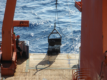 Alles ist ruhig auf dem Schiff. Es ist Nacht. Ich laufe als Wachgänger durch die Gänge und arbeite mich vom gelben Deck vor bis zum dunkelgrünen. Die Brücke. Hier steht das wichtigste Hilfsmittel, das ich zum Dredgen brauche, der Zugschreiber. Das Schiff befindet sich auf Position. Schon ertönt eine Stimme aus dem Funkgerät in meiner Hand, die mir sagt: Es kann losgehen. Über das Heck des Schiffes wird die Dredge in die Tiefen des karibischen Meeres entlassen. Es handelt sich hierbei um einen Kettensack, befestigt an einem Stahlseil. Dieser Kettensack wird bevorzugt an einer steilen Flanke eines Seamounts entlang gezogen und bricht dabei im besten Falle frisches Gestein heraus, das wir als Probenmaterial benötigen. Ich nehme jetzt mein Funkgerät und sage „Winde für Labor“. Nach kurzer Zeit die Antwort „Winde hört“. „Bitte bis 3000 Meter mit 1,2 Meter pro Sekunde fieren“. Ab jetzt heißt es erst mal warten. Es ist dunkel auf der Brücke. Um ein Uhr nachts ist sogar die Helligkeit der Monitore heruntergestellt. Ich schaue gebannt auf die Anzeige der Seillänge, wie die Dredge in immer größere Tiefen absinkt. Dann ist es soweit, der Boden rückt näher. Um die Dredge nicht zu schnell aufkommen zu lassen, gebe ich den Befehl durch mein Funkgerät, mit 0,5 Meter pro Sekunde weiter zu fieren. Jetzt ist auch der Zeitpunkt erreicht, an dem ich den Zugschreiber anschalte. Es ist ein kleines Gerät mit Papier und einer Art Farbnadel, die sich, je nachdem wie viele Tonnen Gweicht auf dem Seil liegen, bewegt. Es erinnert ein bisschen an ein EKG-Gerät. Jetzt da das Gerät arbeitet, ist es möglich, den ungefähren Zeitpunkt zu sehen, an dem die Dredge auf den Boden trifft. Dies macht sich dann in einer plötzlichen Entlastung bemerkbar und der Farbstift schlägt leicht nach links aus. Das Schiff nimmt nun wieder Fahrt auf und bewegt sich entlang eines vorher festgelegten Profils. Ab und zu gebe ich den Befehl, mehr Kabel auszulegen. Als wir unseren Endpunkt des Profils erreicht haben, fängt das eigentliche Dredgen an. „Bitte hieven mit 0,3“. Von nun an habe ich den Zugschreiber besonders im Auge. Schnell bewegt er sich von rechts nach links und schon sind die ersten "Bites" zu sehen. Das heißt, kurzzeitig steigt der Zug an (bei mir auf 6 Tonnen) und lässt dann ruckartig wieder los. Die Dredge arbeitet. Schritt für Schritt beißt sie sich durch das Gestein und bricht hoffentlich viele Stücke für uns ab. Gegen Ende werden schon die ersten Wetten entgegen genommen, wie voll die Dredge wohl sein wird. Der spannendste Moment kommt beim Einholen des Stahlseils, als ein Crewmitglied am Heck der Meteor stehend signalisiert, dass er die Dredge sehen kann. Langsam wird sie weiter gehievt und die Spannung steigt. Hab ich meine Arbeit gut gemacht? Der erste Teil der Dredge erscheint. Noch lässt nichts darauf schließen, wie viel wohl drin sein wird. Doch dann taucht der Kettensack auf und ein Durchatmen ist von mir zu vernehmen. Halbvoll. Nicht schlecht. Schnell wird die Dredge entleert und schon stehen die ersten Helferlein der Wissenschaftler mit ihren blauen Kisten bereit und sammeln fleißig die Proben ein. Zur weiteren Bearbeitung werden die Gesteine ins Labor gebracht und erst einmal untersucht. Doch das ist eine andere Geschichte.
