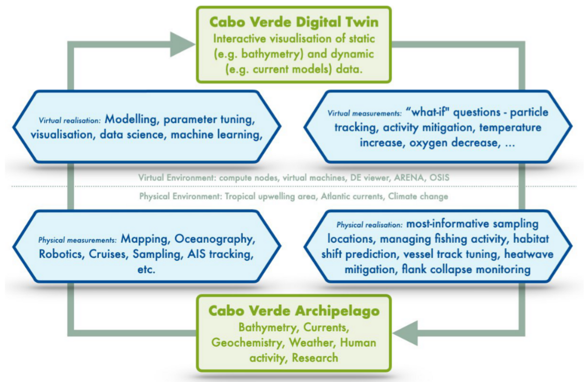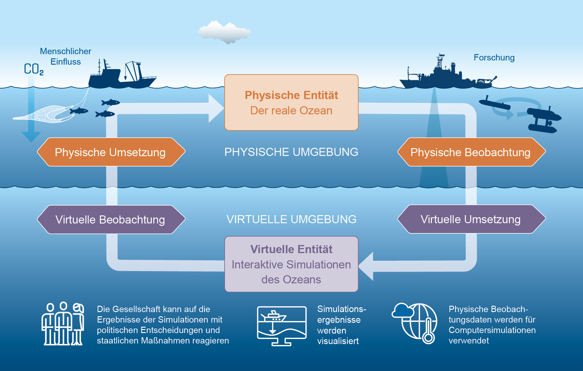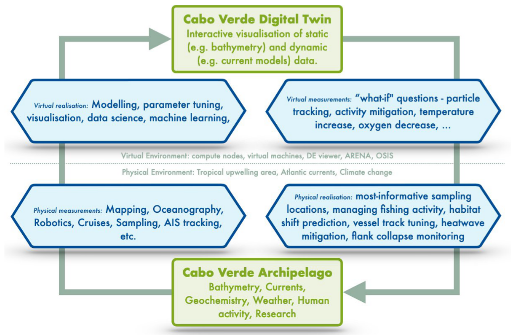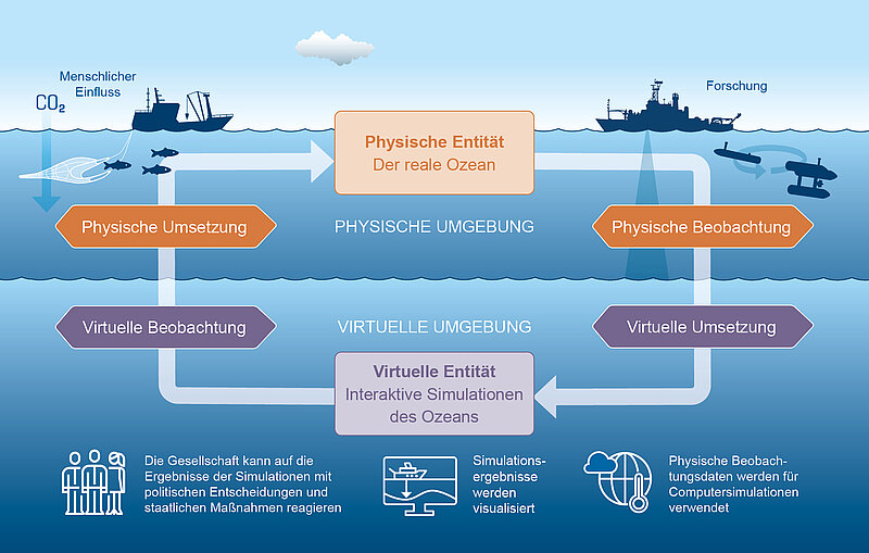 Ein Digitaler Zwilling besteht dabei aus einer virtuellen Entität (Simulationen des Ozeans) die eine physische Entität (den realen Ozean) repräsentiert. Diese beiden Entitäten sind miteinander durch Informationsaustausch verknüpft, sodass sie sich gegenseitig beeinflussen können. Die Verknüpfung bestehen aus einer Beobachtung der virtuellen oder physischen Entität und einer Umsetzung des Beobachtungsergebnisses zur Veränderung der jeweils anderen Entität. Beide – die virtuelle und physische Entität existieren nicht losgelöst, sondern innerhalb einer virtuellen bzw. physischen Umgebung und werden durch Einflüsse dieser Umgebungen geprägt.