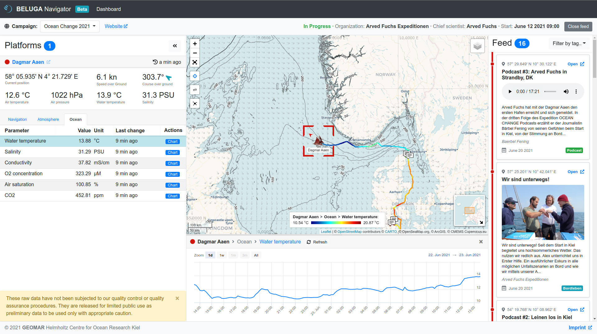 „Wir unterstützen die Expedition ferner durch den Einsatz einer Erweiterung unserer Kommunikationsplattform BELUGA. Eine von uns entwickelte Software, welche die Messdaten zusammenführt, visualisiert diese und stellt sie im Zusammenhang mit der Route dar. Dies ermöglicht den Betrachtern, die aktuellen und vergangenen Bedingungen in und über dem Ozean während der OceanChange 2021 Expedition in einem Blick zu erfassen und mit weiteren Inhalten wie Informationen zum Leben an Bord, Naturphänomenen oder wissenschaftlichen Themen zu verbinden“, erläutert Dr. Karstensen.