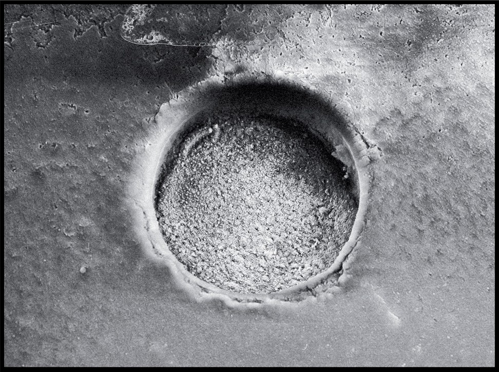 160 Mikrometer kleiner Messkrater im vulkanischen Glas: Er entsteht, wenn ein Laser winzige Mengen Material aus der Probe herausschießt. Dieses Material wird mit einem Gas in ein Massenspektrometer eingebracht, dort stark erhitzt und in seine Bestandteile zerlegt. So können Forschende genau bestimmen, welche Elemente und Isotope in der Probe enthalten sind.
