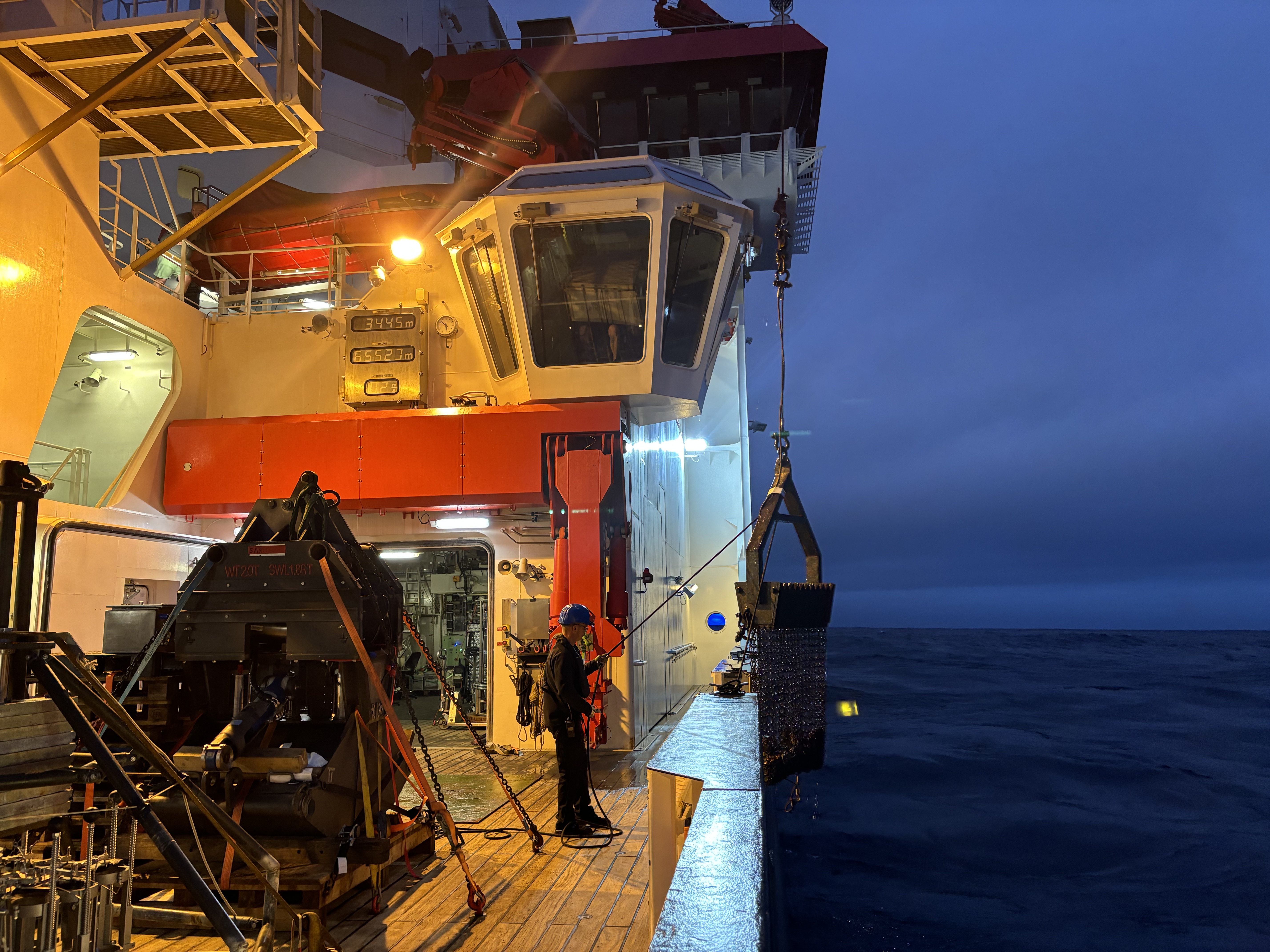 Die Kettensackdredge wird wieder an Bord gehievt: Probennahme während der Expedition mit dem Forschungsschiff SONNE in den Südpazifik.