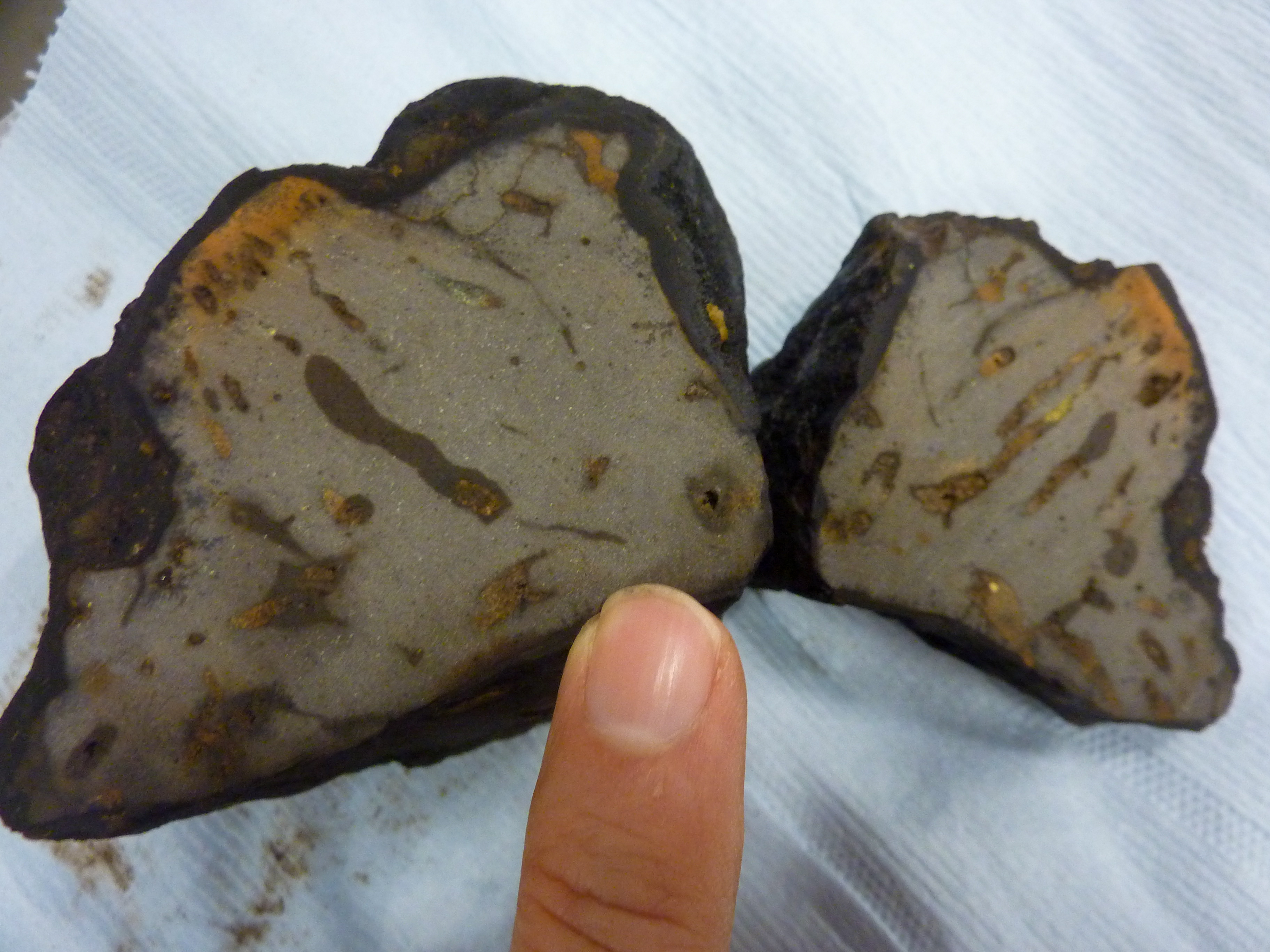 Aufgesägtes basaltisches Vulkangestein: Deutlich sind die länglichen Blasenhohlräume zu erkennen, die entstehen, wenn aus dem Magma austretende Gase in der noch flüssigen Lava nach außen streben. Die Gesteinsprobe ist von einer wenigen Millimeter dicken schwarzen Mangankruste bedeckt. Foto: Jörg Geldmacher, GEOMAR