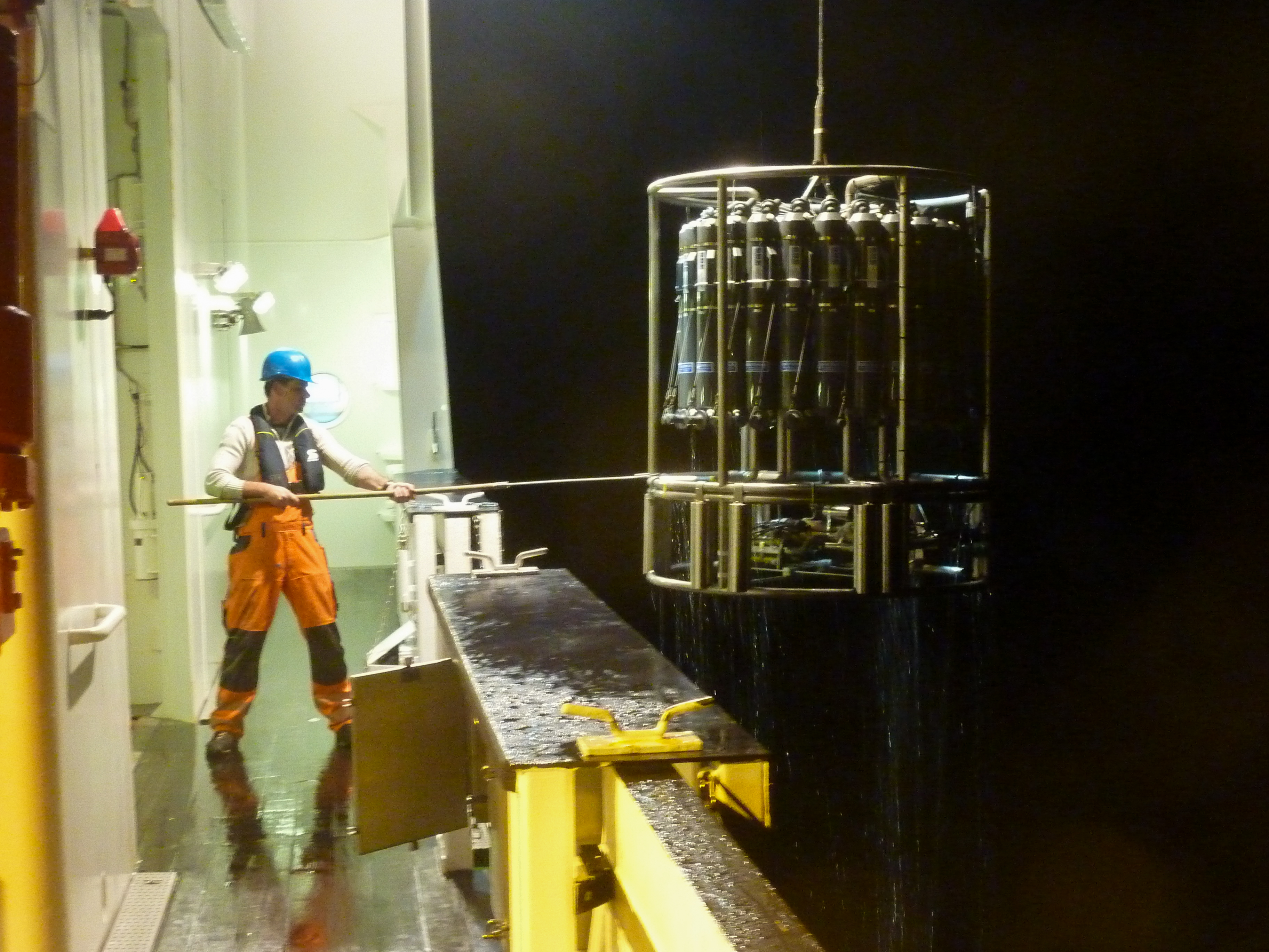 Nächtlicher Einsatz der CTD-Rosette auf dem Forschungsschiff SONNE: Mit den grauen Flaschen des Kranzwasserschöpfers werden Wasserproben aus verschiedenen Tiefen genommen, während Sensoren im unteren Bereich der Sonde verschiedene ozeanographische Parameter wie Temperatur, Leitfähigkeit und Tiefe messen. Foto: Jörg Geldmacher, GEOMAR